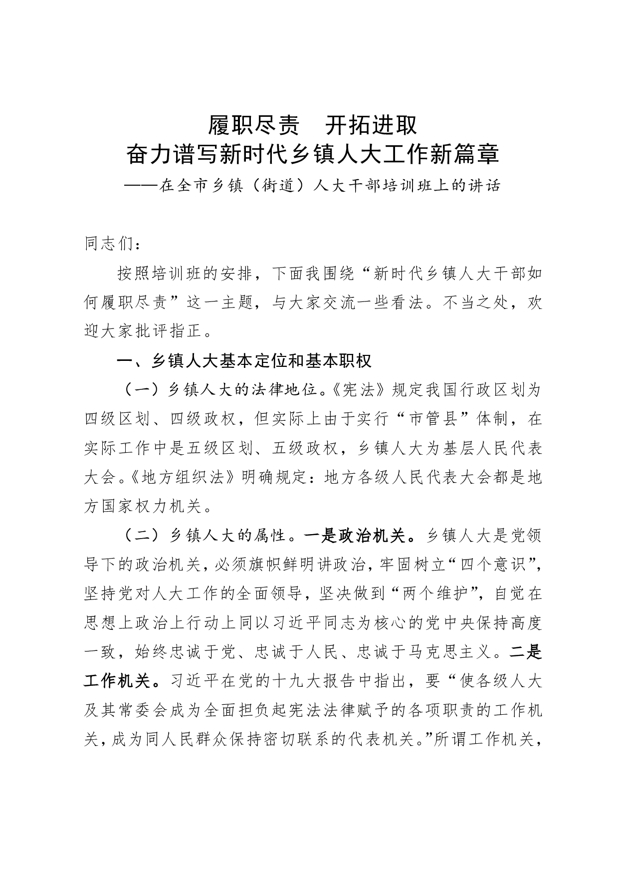 标题:履职尽责开拓进取奋力谱写新时代乡镇人大工作新篇章在全市乡镇街道人大干部培训班上的讲