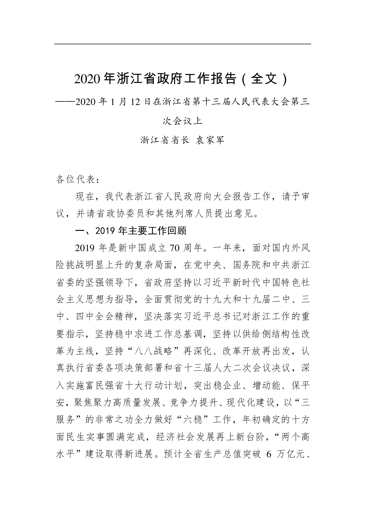 标题:2020年浙江省政府工作报告(全文)