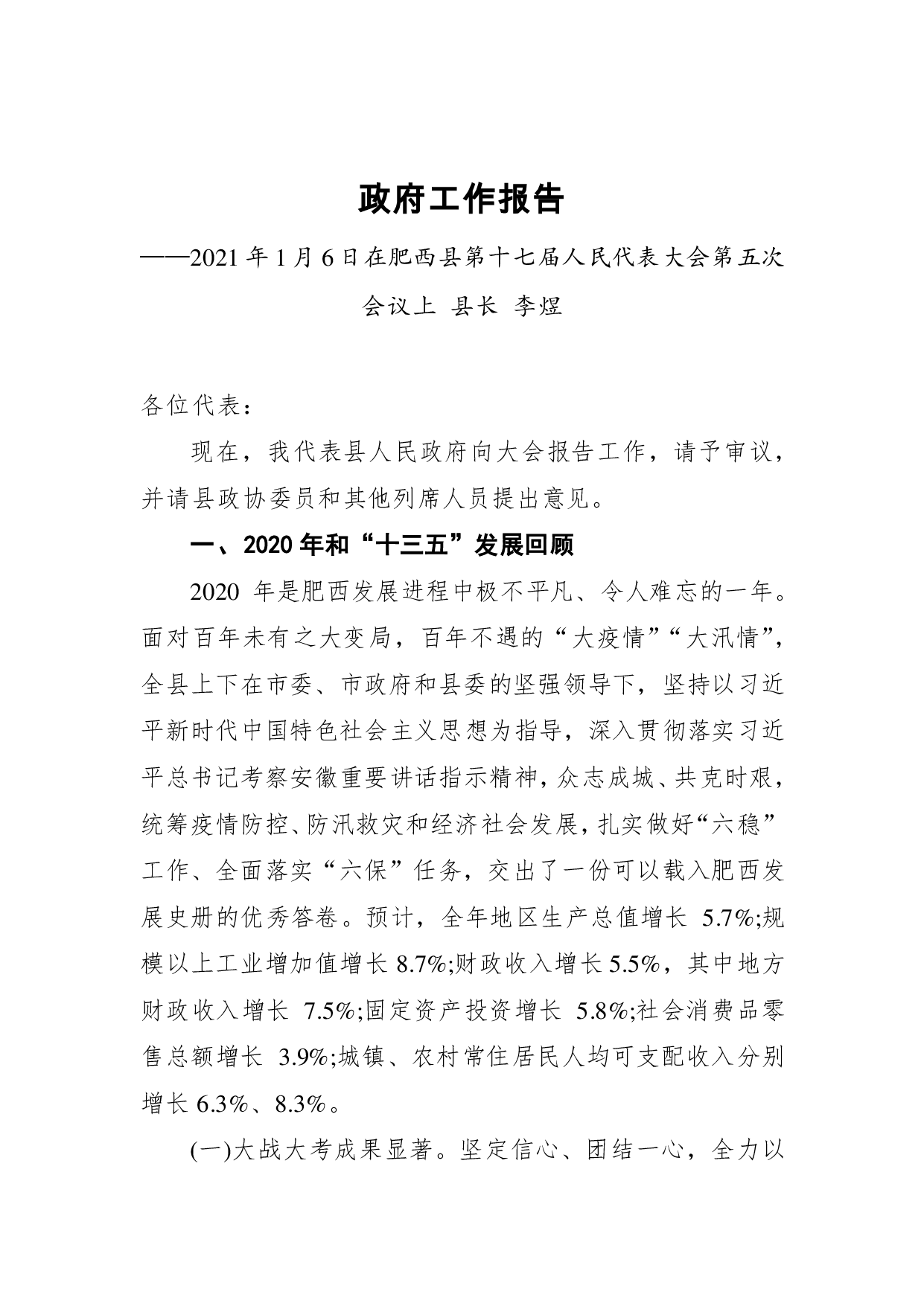 标题:2021年肥西县政府工作报告