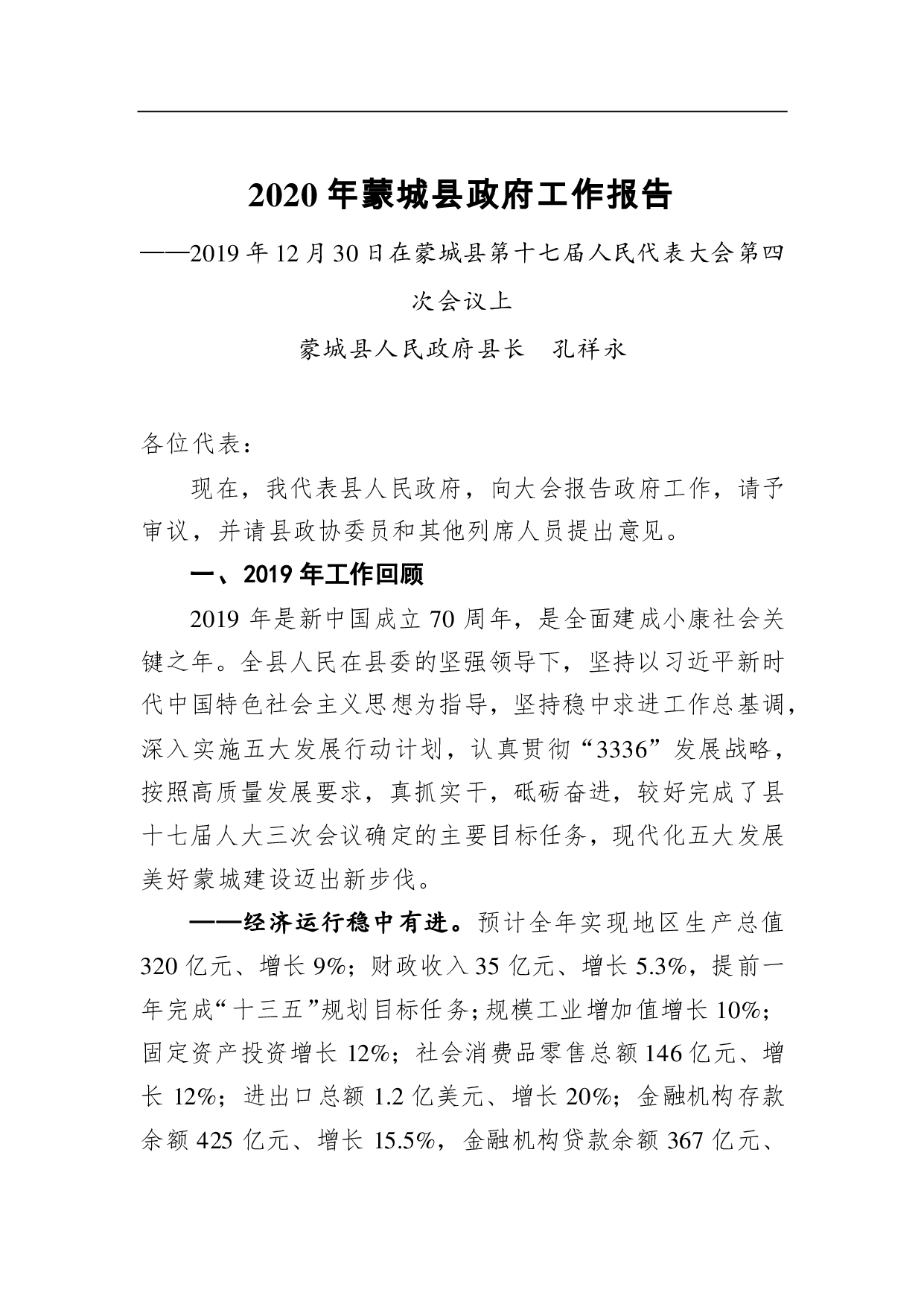 标题:2020年蒙城县政府工作报告