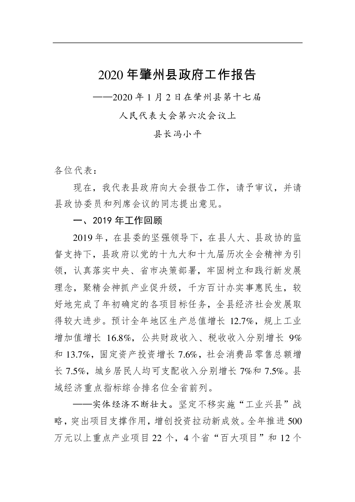 标题:2020年肇州县政府工作报告