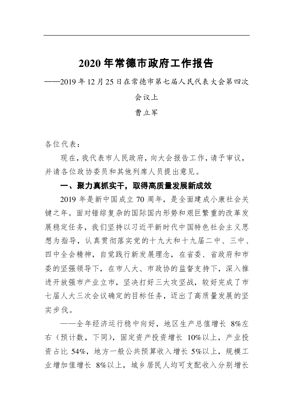 标题:2020年常德市政府工作报告
