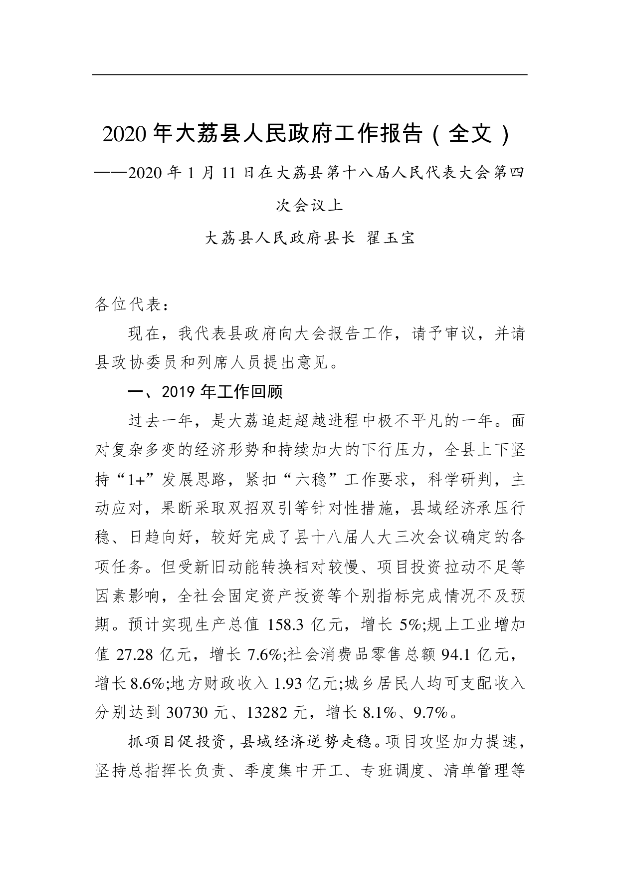 标题:2020年大荔县人民政府工作报告(全文)