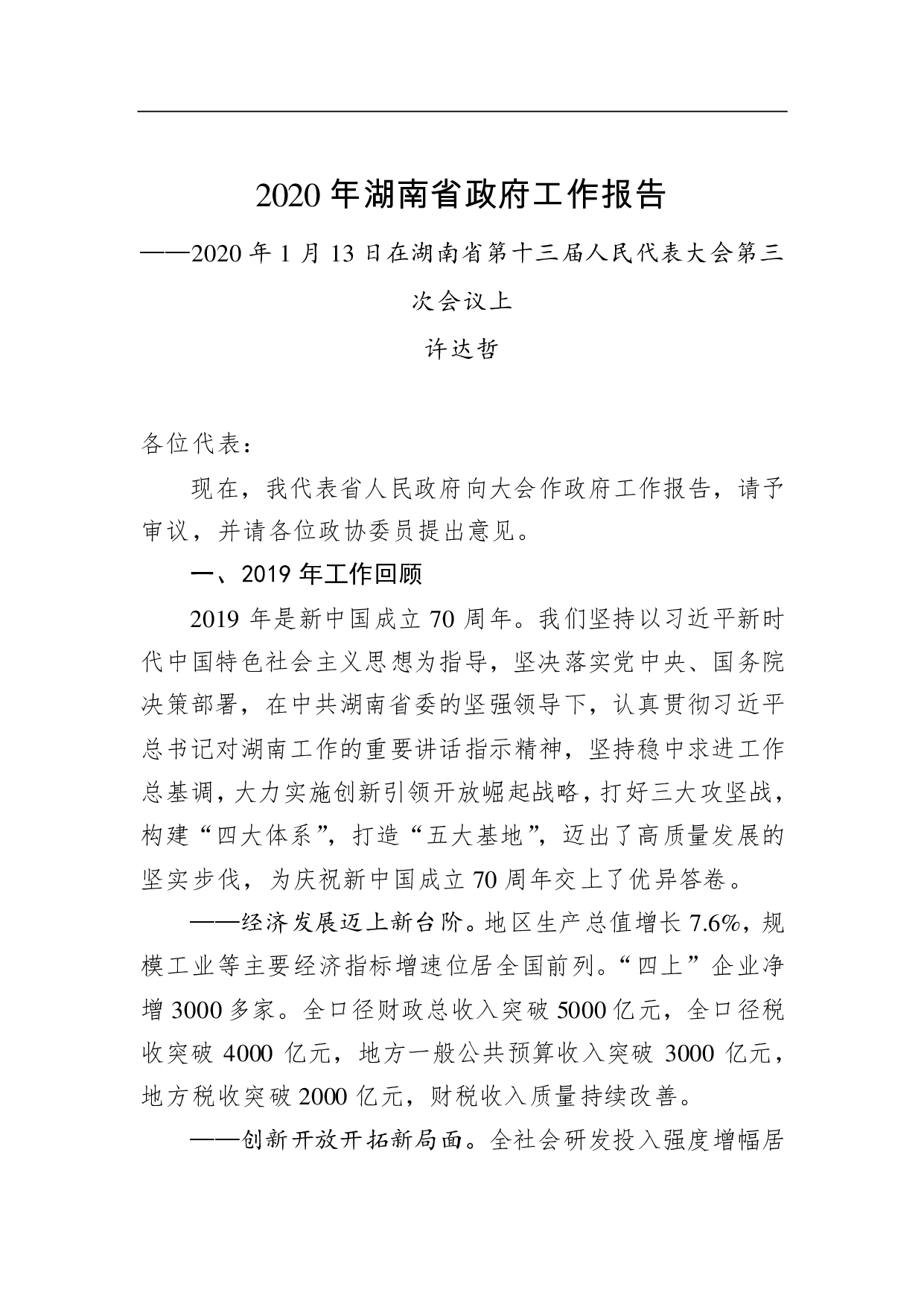 标题:2020年湖南省政府工作报告