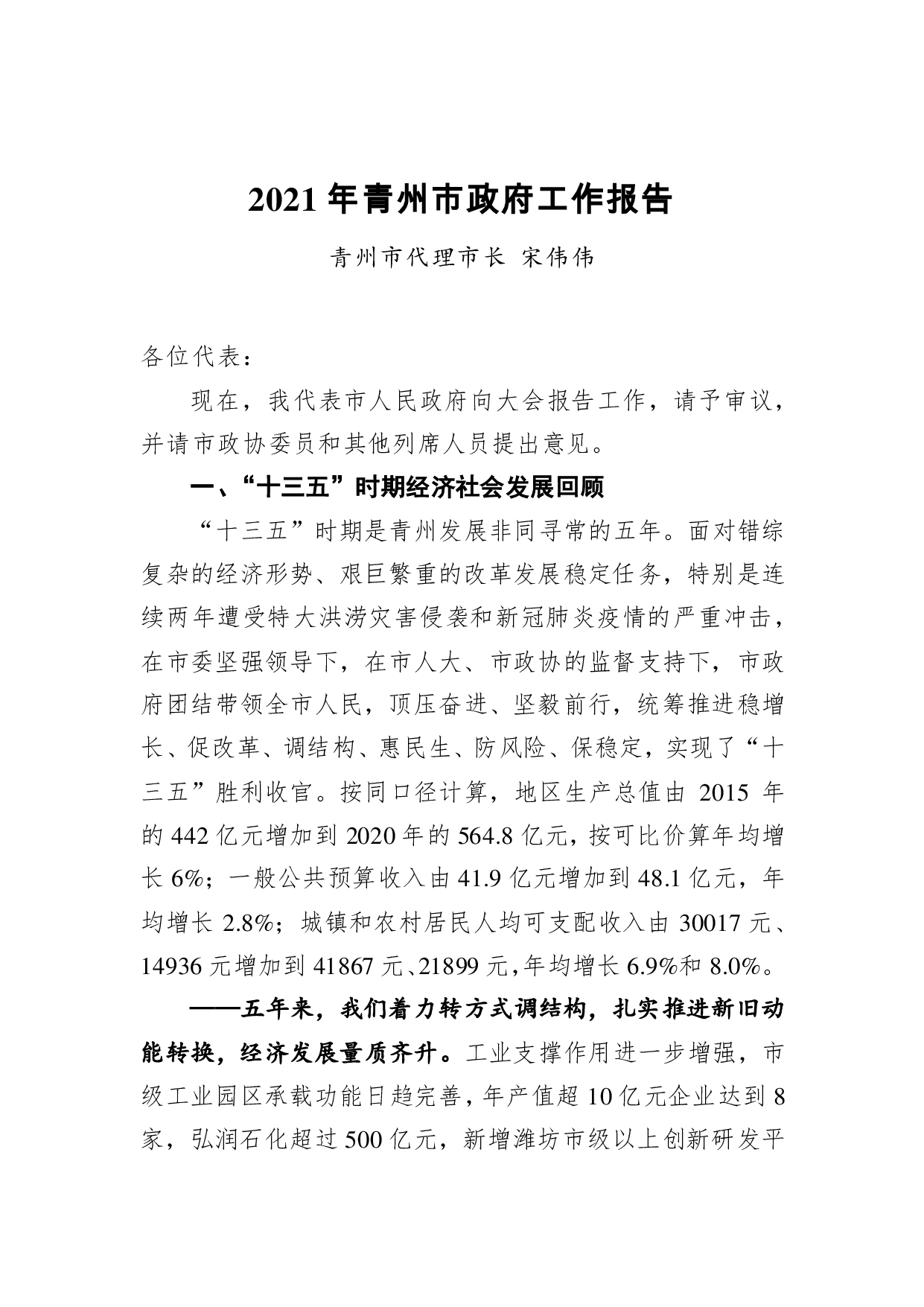 标题:2021年青州市政府工作报告