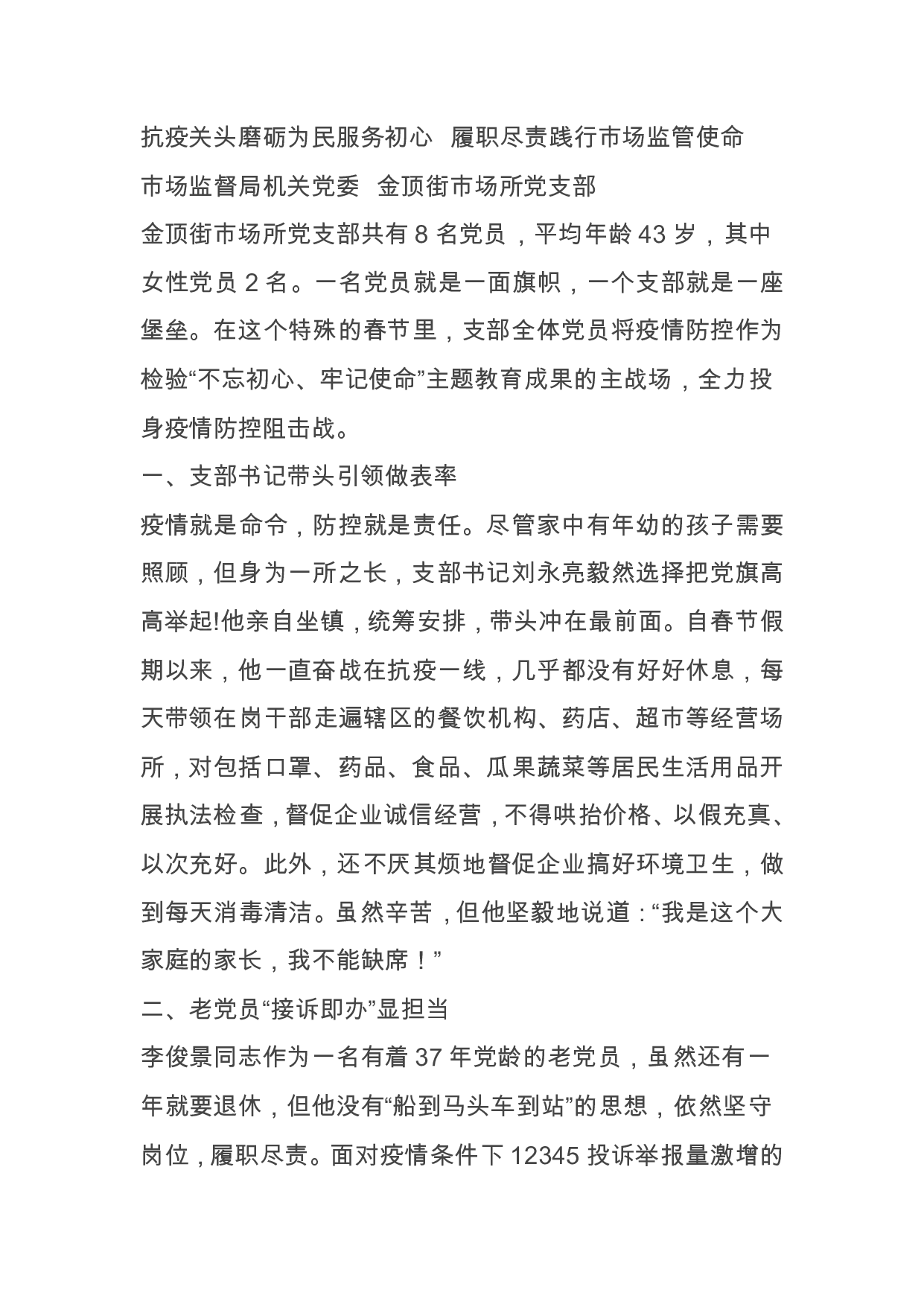 标题:市场监督局机关市场所党支部抗击新冠疫情先进集体事迹