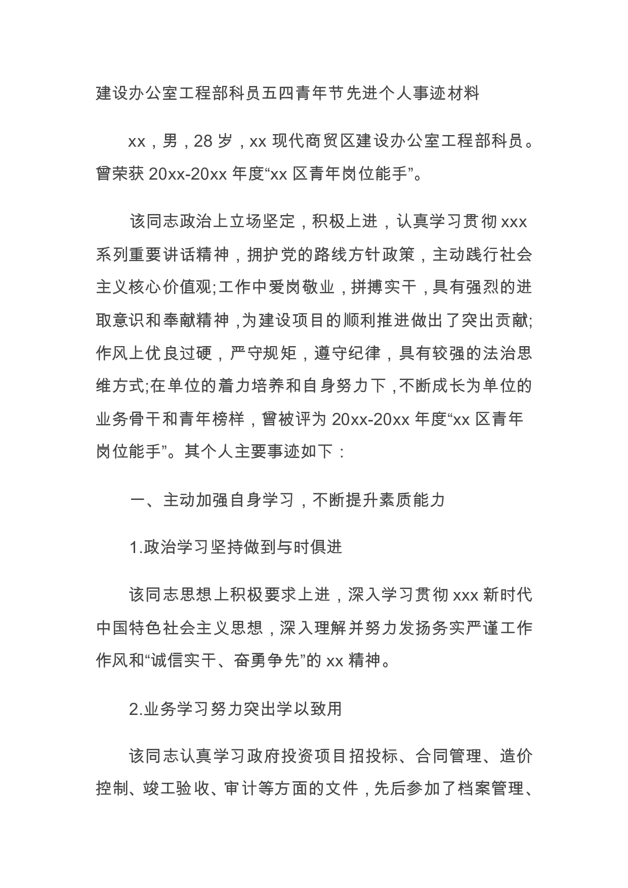 标题:建设办公室工程部科员五四青年节先进个人事迹材料