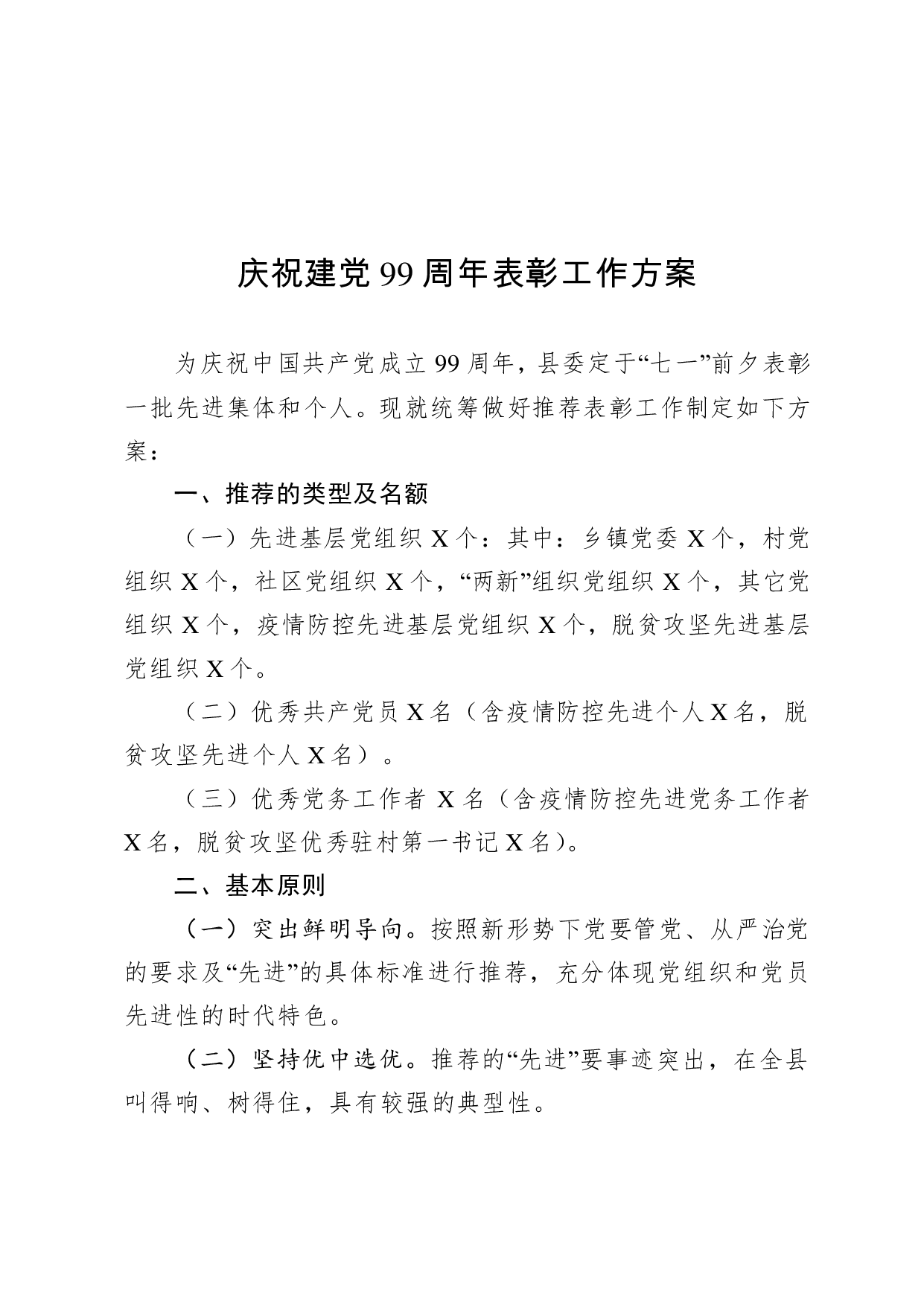 标题:庆祝建党99周年表彰工作方案含各类先进事迹5篇