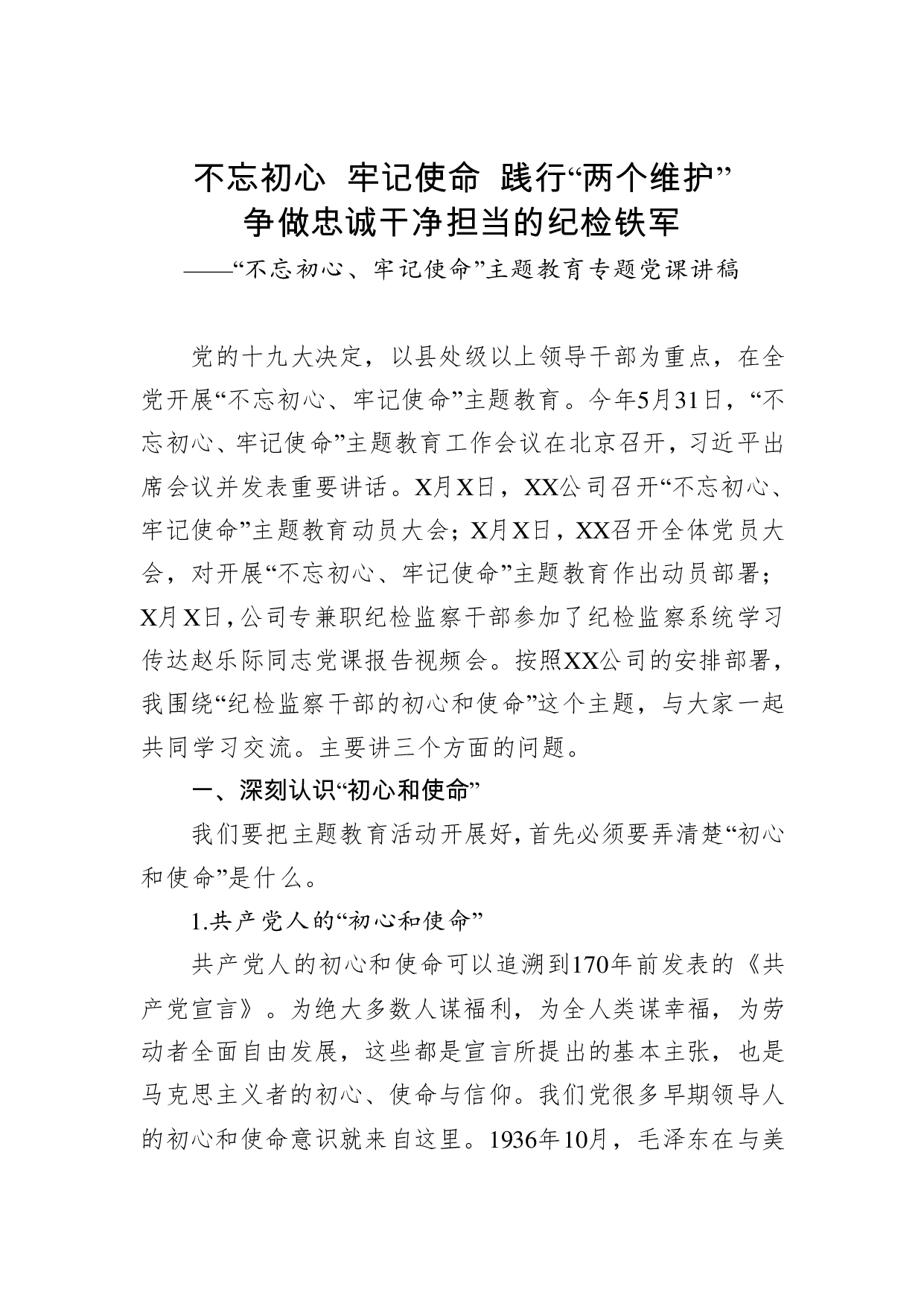 标题:不忘初心牢记使命践行两个维护争做忠诚干净担当的纪检铁军