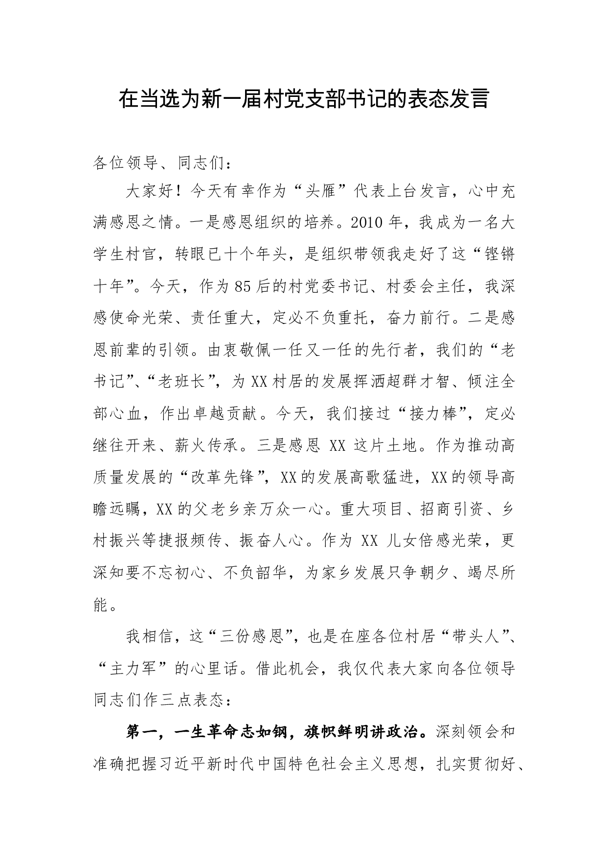 标题:在当选为新一届村党支部书记的表态发言
