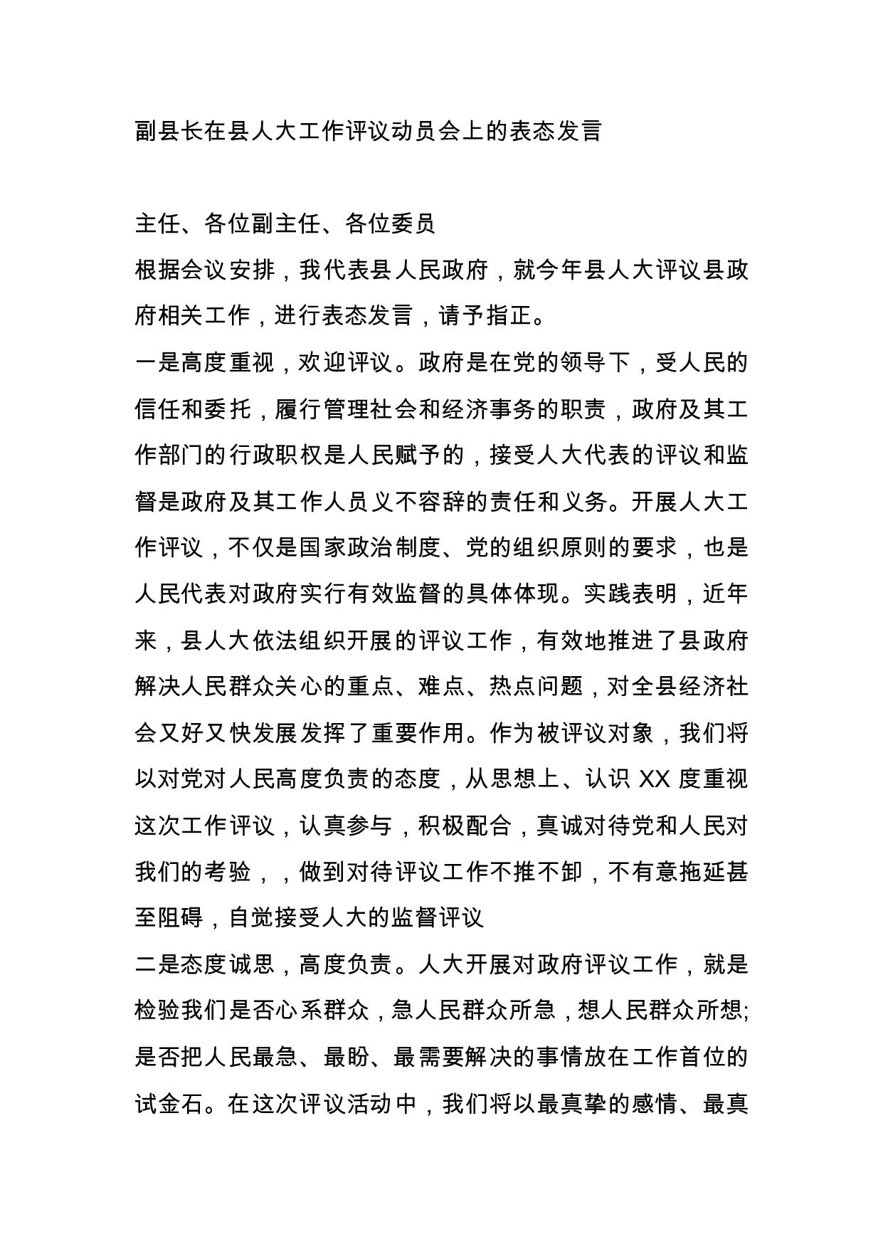 标题:副县长在县人大工作评议动员会上的表态发言