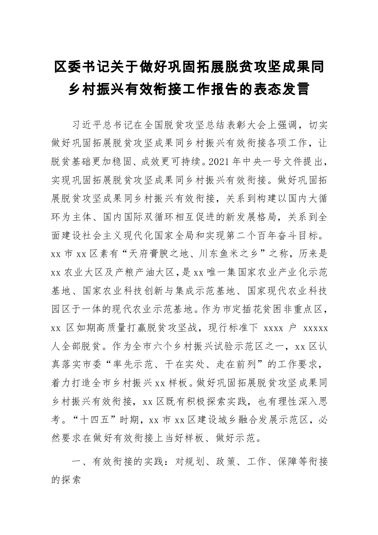 标题:区委书记关于做好巩固拓展脱贫攻坚成果同乡村振兴有效衔接工作报告的表态发言