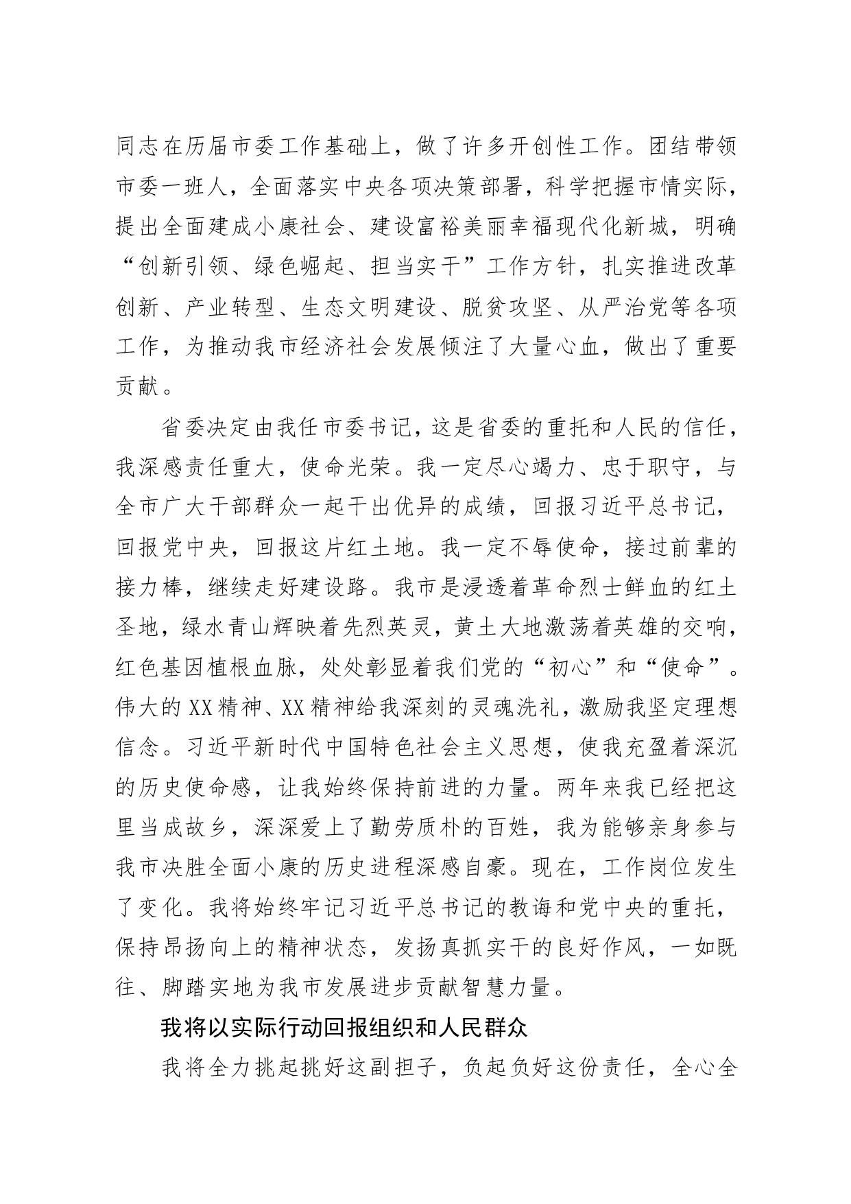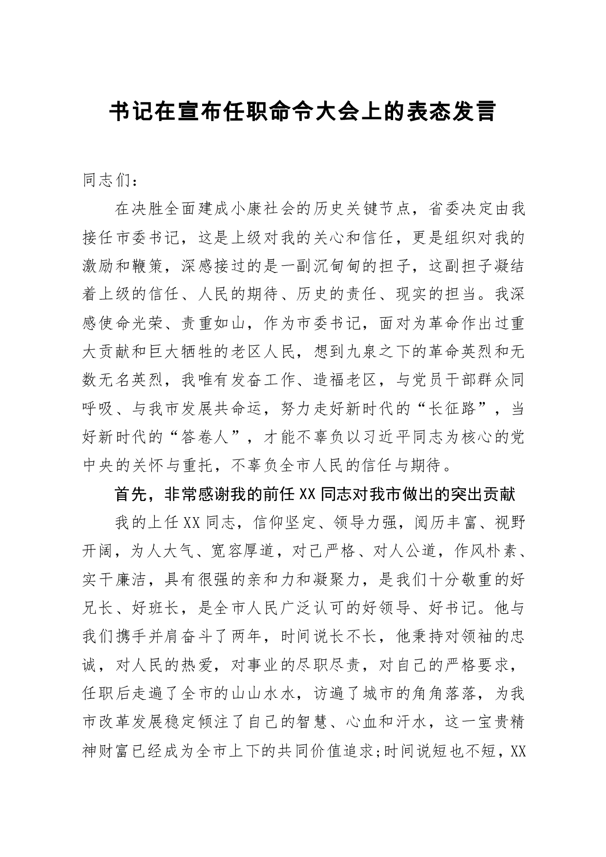 标题:书记在宣布任职命令大会上的表态发言