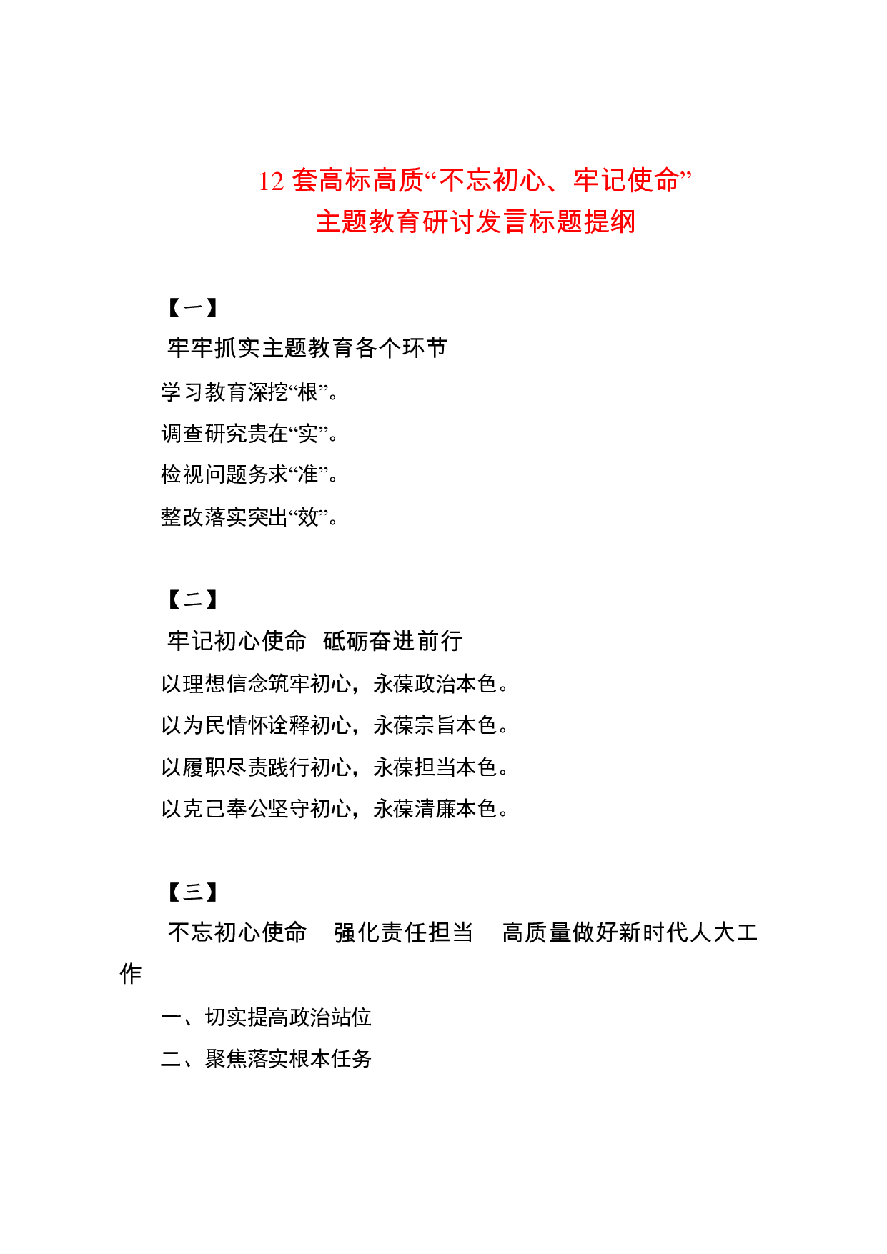 标题:【写作素材】12套高标高质不忘初心牢记使命主题教育研讨发言标题