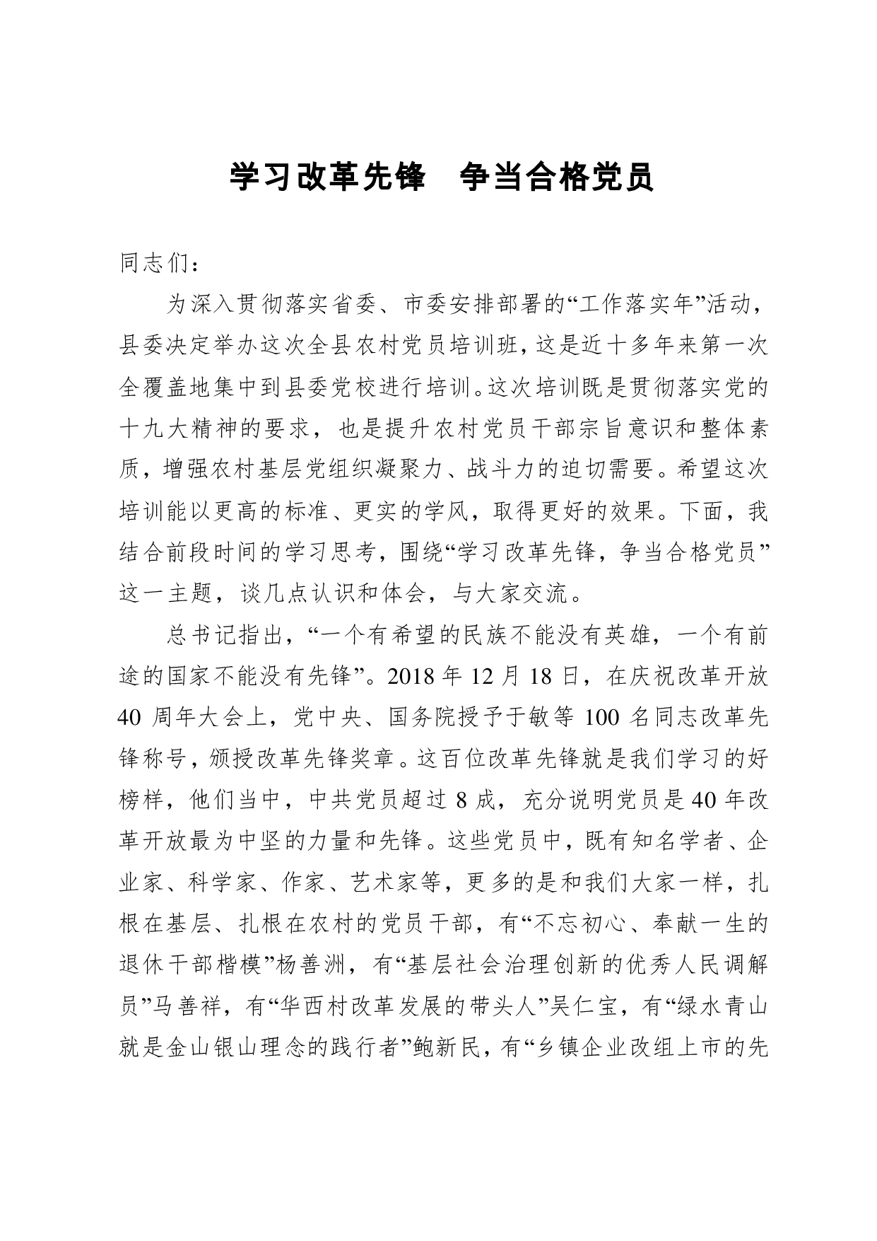 标题:【党课范文】学习改革先锋 争当合格党员县长在全县农村党员培训班上的党课讲稿
