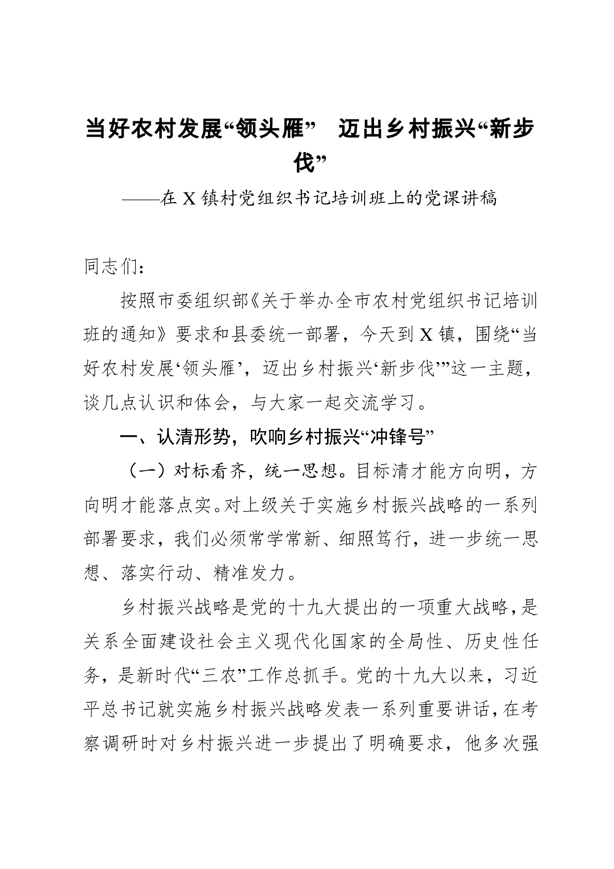 标题:【党课范文】当好农村发展领头雁迈出乡村振兴新步伐农村党组织党课讲稿