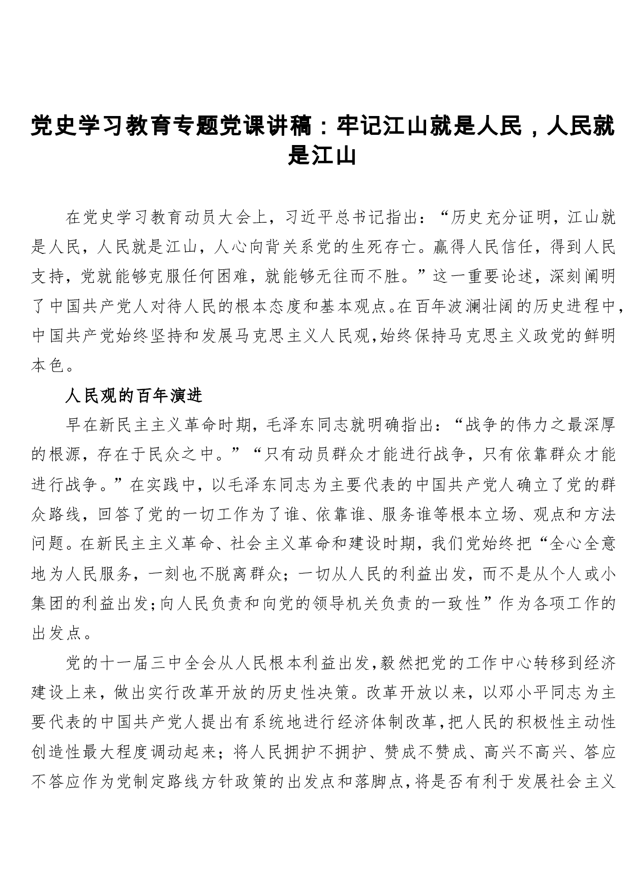 标题:党史学习教育专题党课讲稿:牢记江山就是人民,人民就是江山