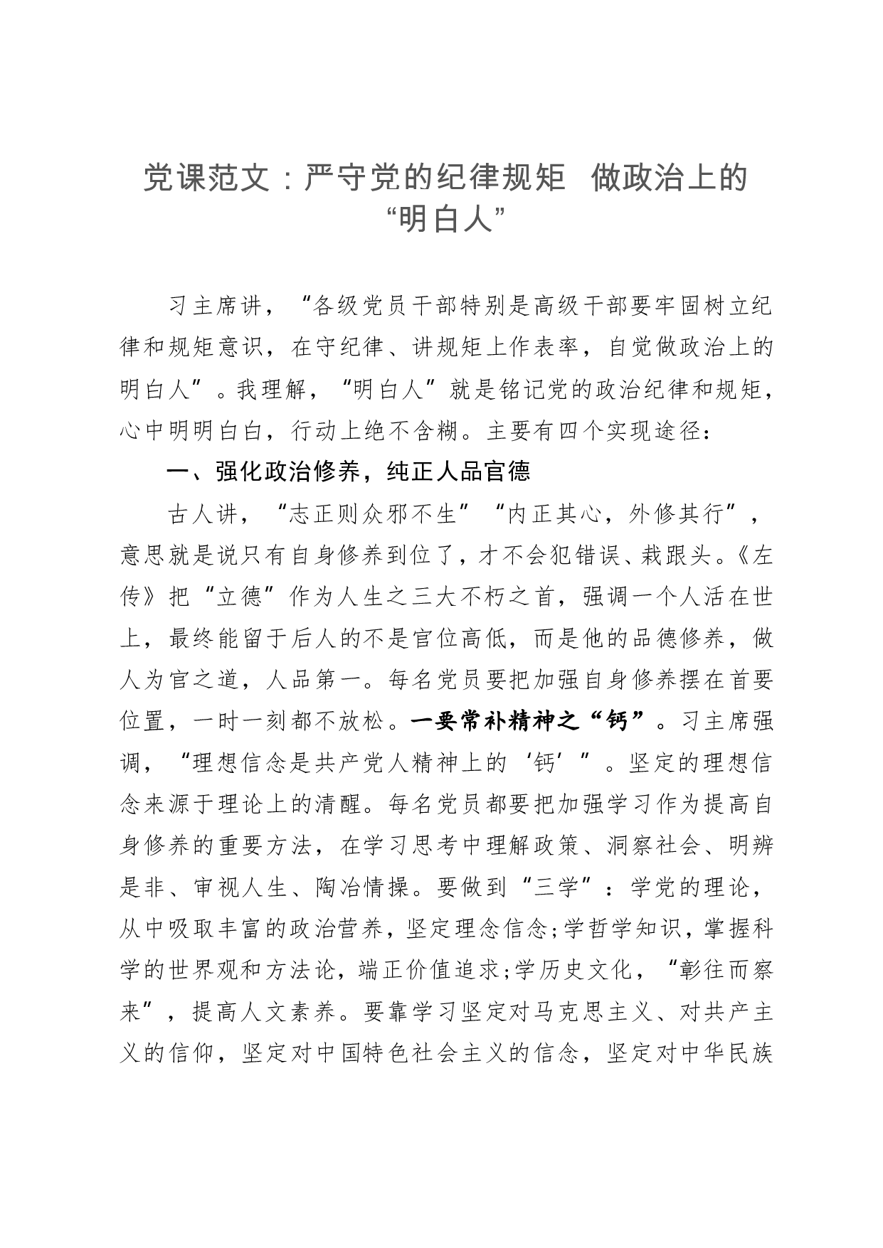 标题:党课范文:严守党的纪律规矩 做政治上的“明白人”