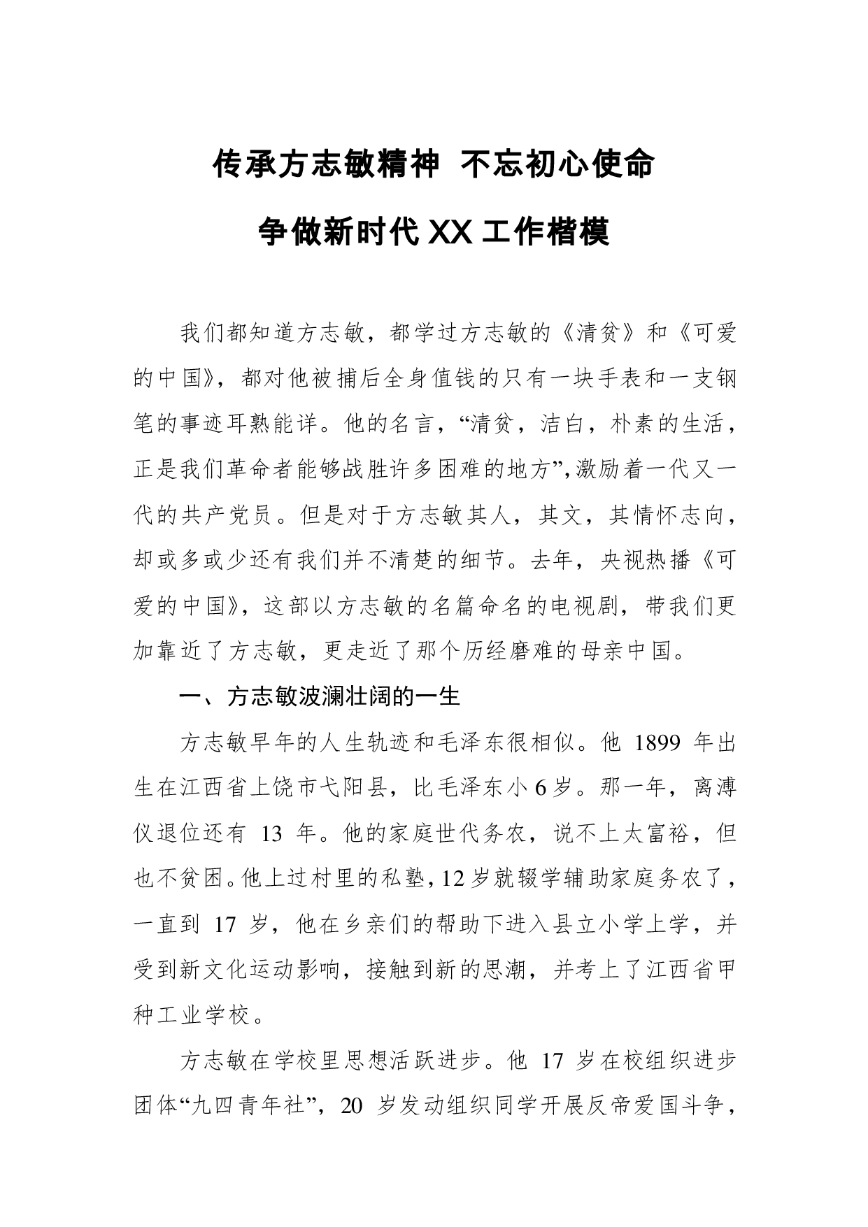 标题:七一微党课不忘初心使命传承方志敏精神争做新时代XX工作楷模