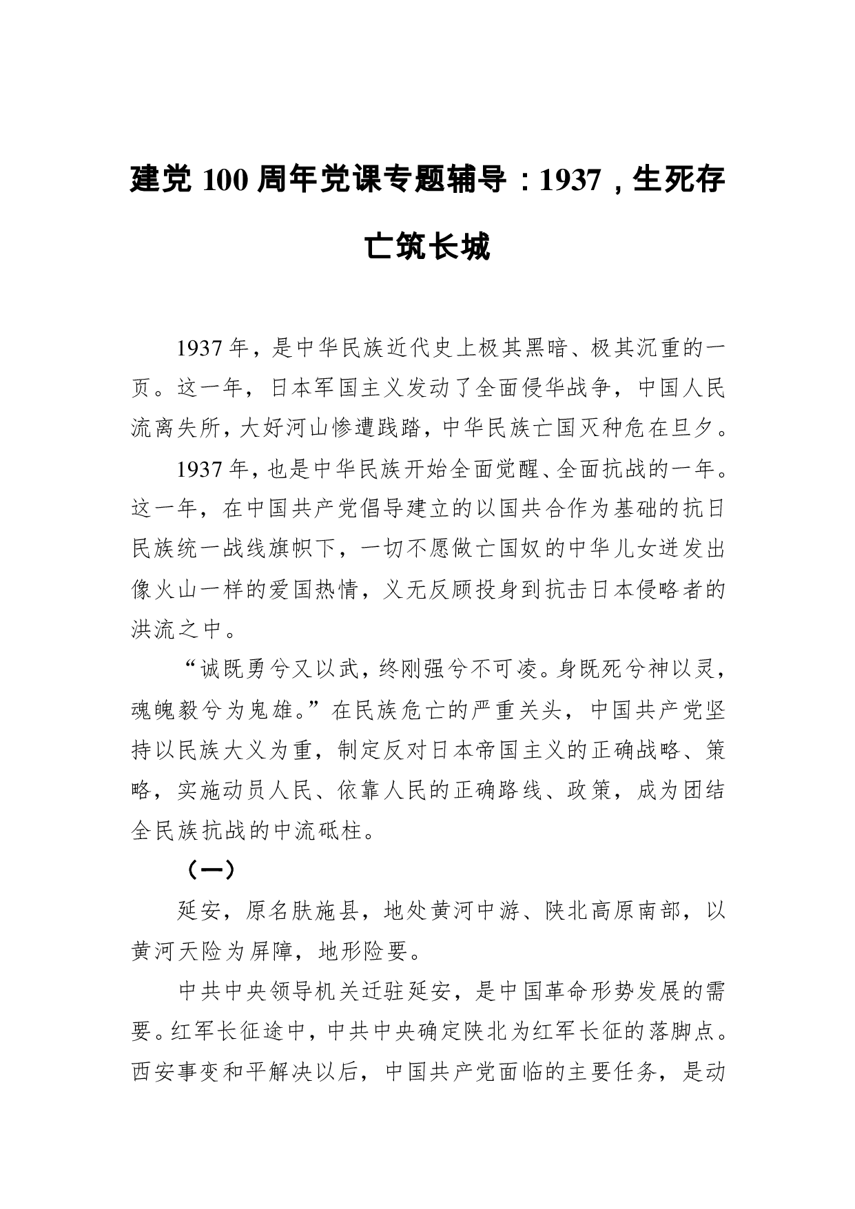 标题:建党100周年党课专题辅导:1937,生死存亡筑长城