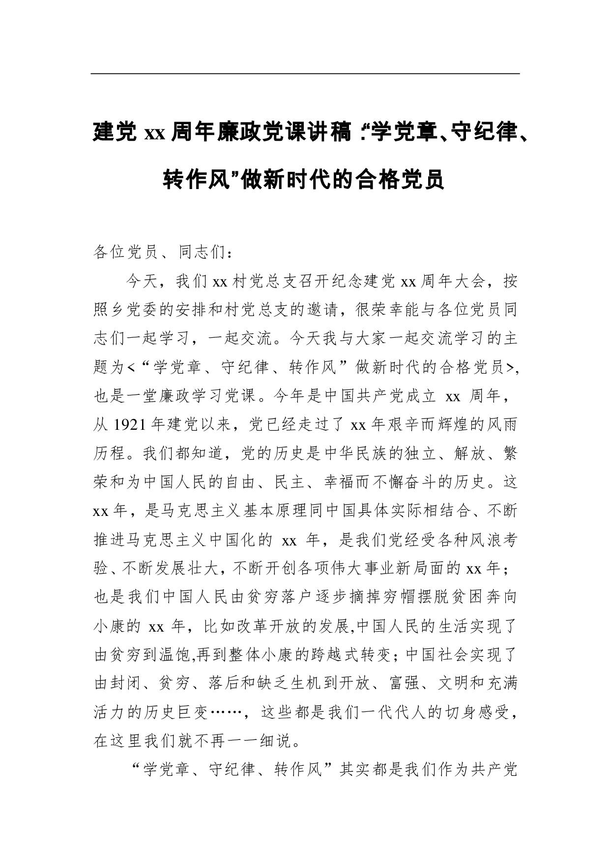 标题:建党xx周年廉政党课讲稿:“学党章、守纪律、转作风”做新时代的合格党员