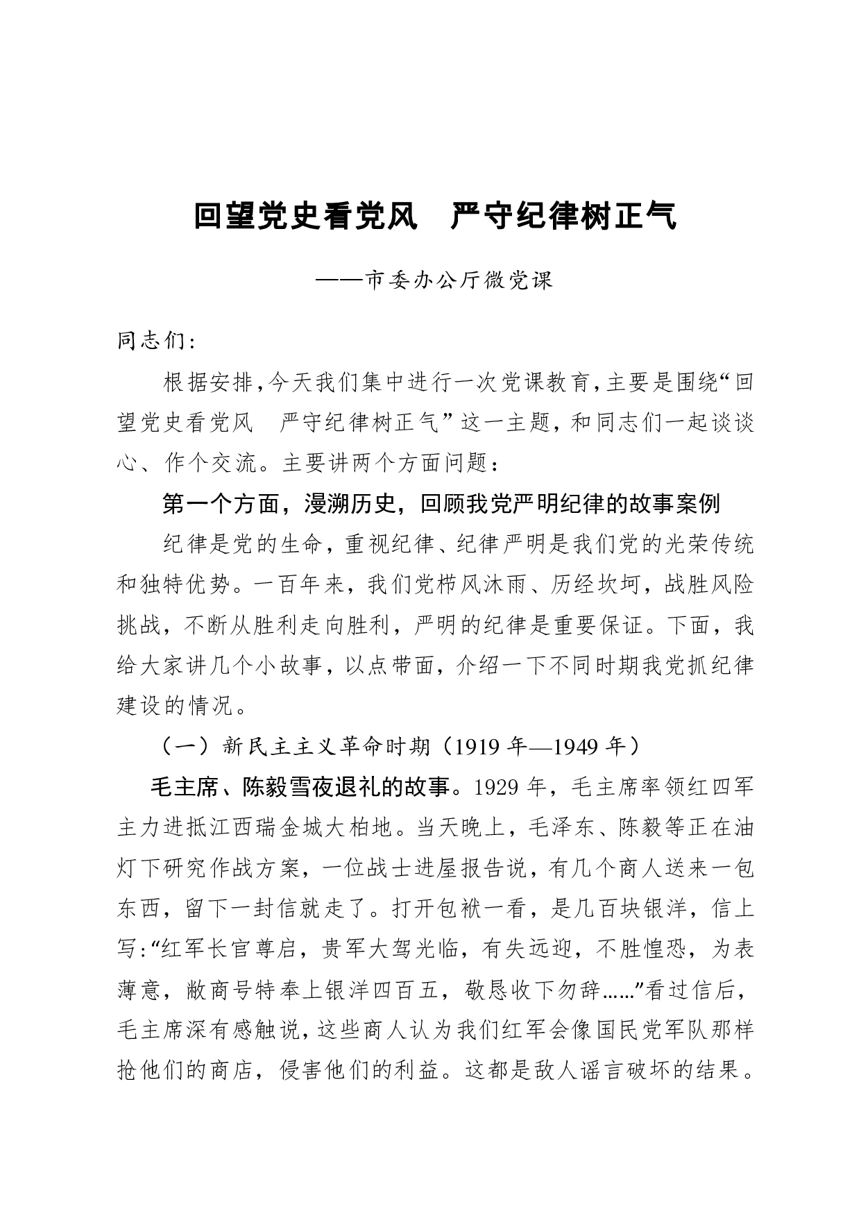 标题:【党课范文】回望党史看党风 严守纪律树正气