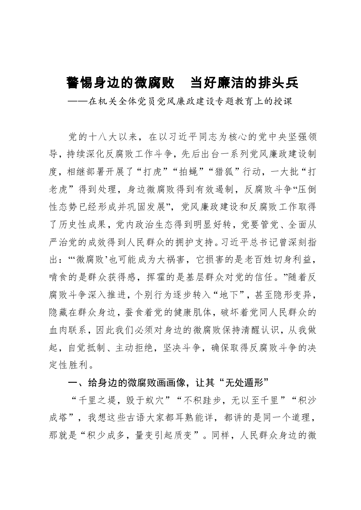 标题:党课警惕身边的微腐败 当好廉洁的排头兵