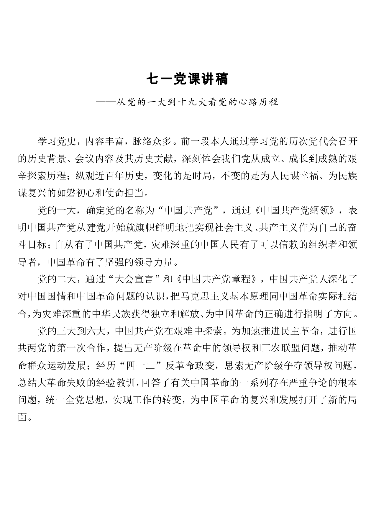 标题:七一党课讲稿 ——从党的一大到十九大看党的心路历程
