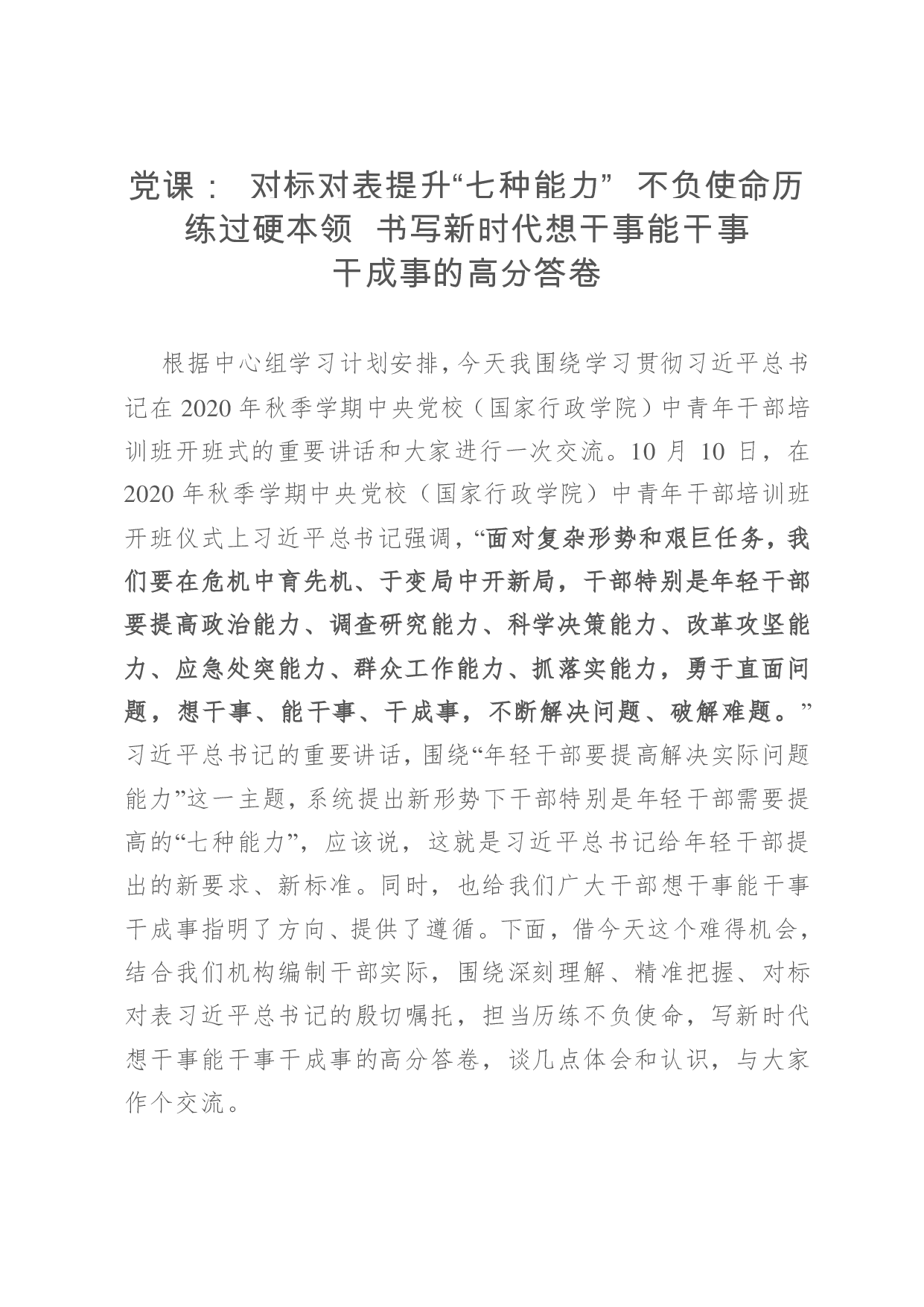 标题:党课: 对标对表提升“七种能力” 不负使命历练过硬本领 书写新时代想干事能干事干成事的