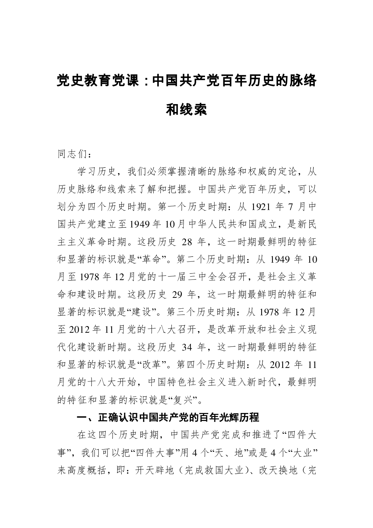 标题:党史教育党课:中国共产党百年历史的脉络和线索