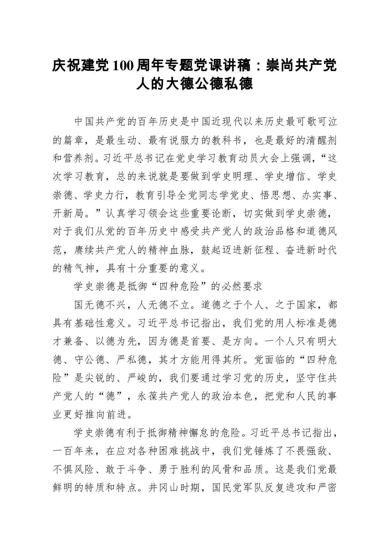 标题:【党课范文】庆祝建党100周年专题党课讲稿崇尚共产党人的大德公德私德