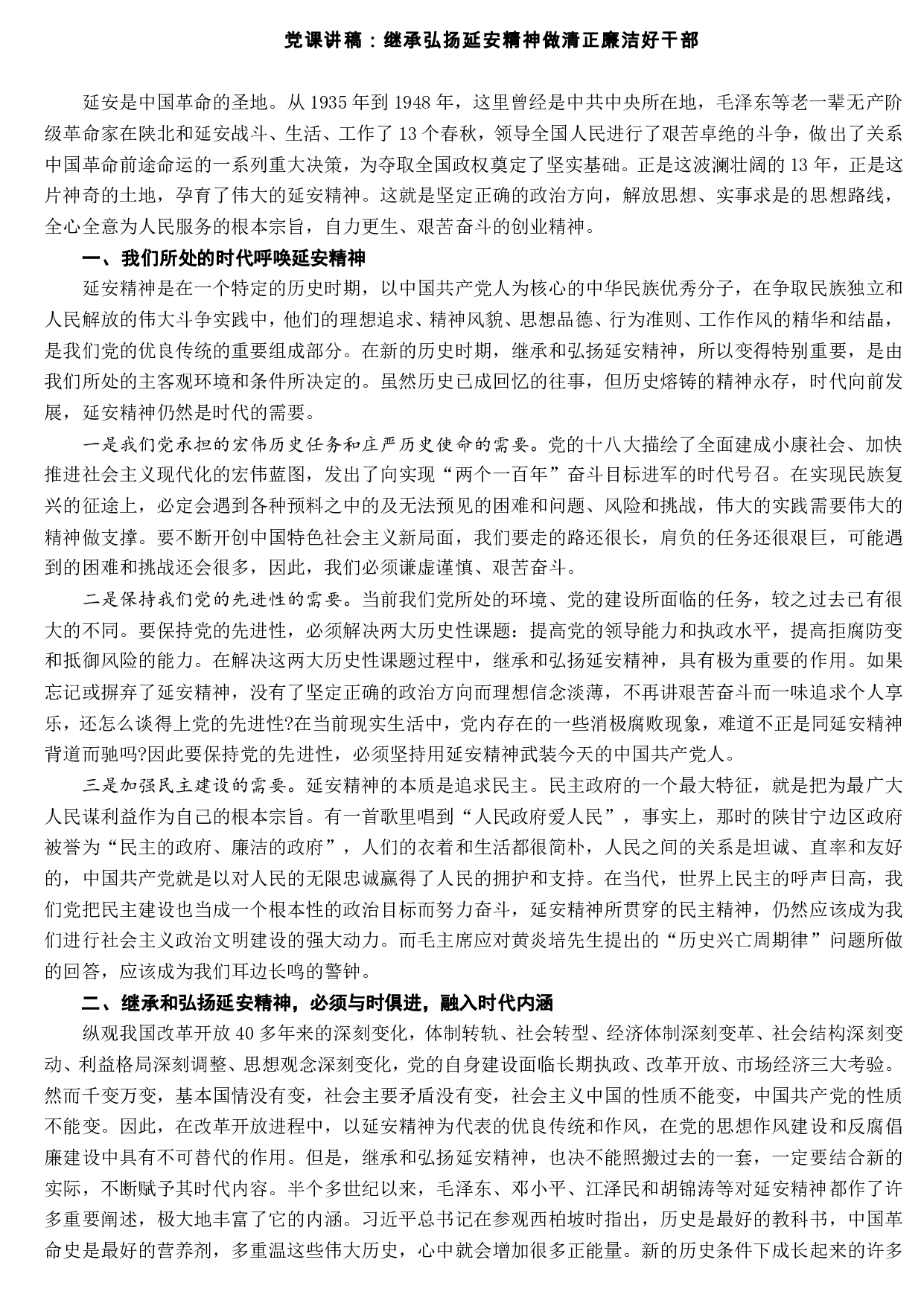 标题:党课讲稿:继承弘扬延安精神_做清正廉洁好干部