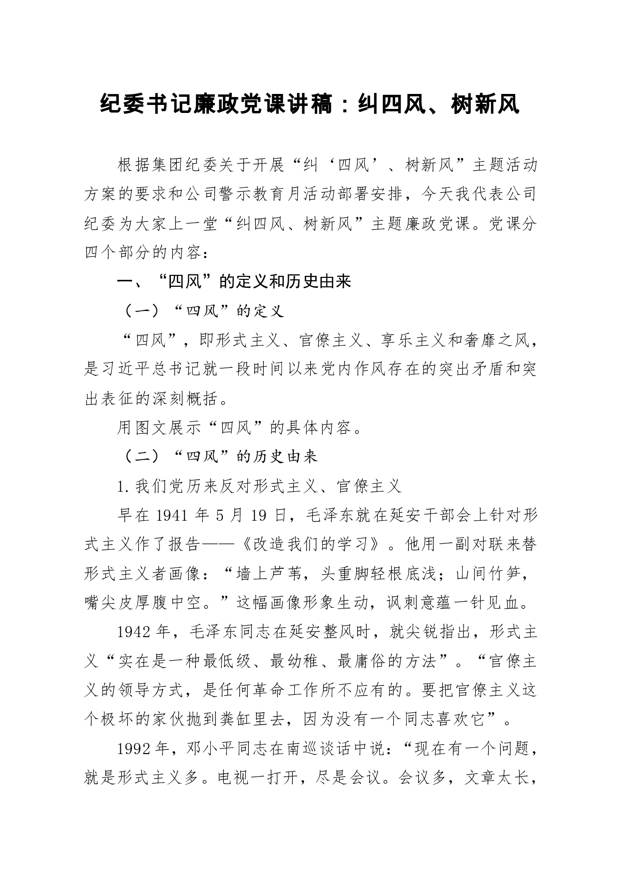 标题:纪委书记廉政党课讲稿纠四风树新风集团公司