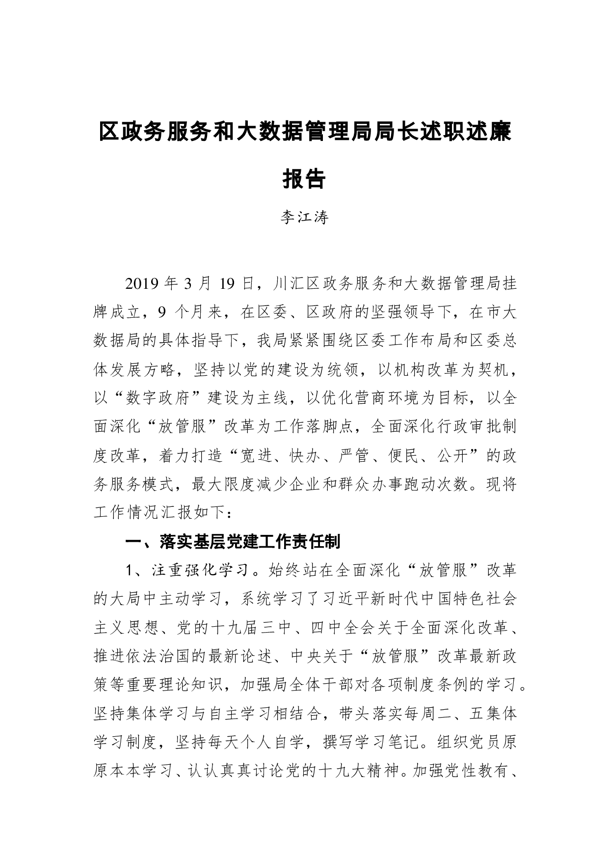 标题:李江涛:区政务服务和大数据管理局局长述职述廉报告