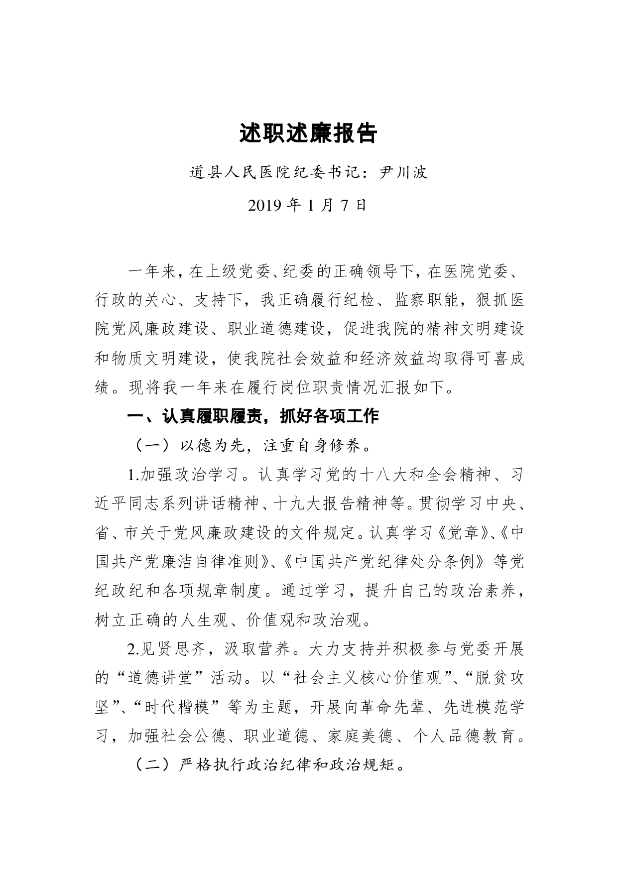 标题:医院纪委书记述职述廉报告