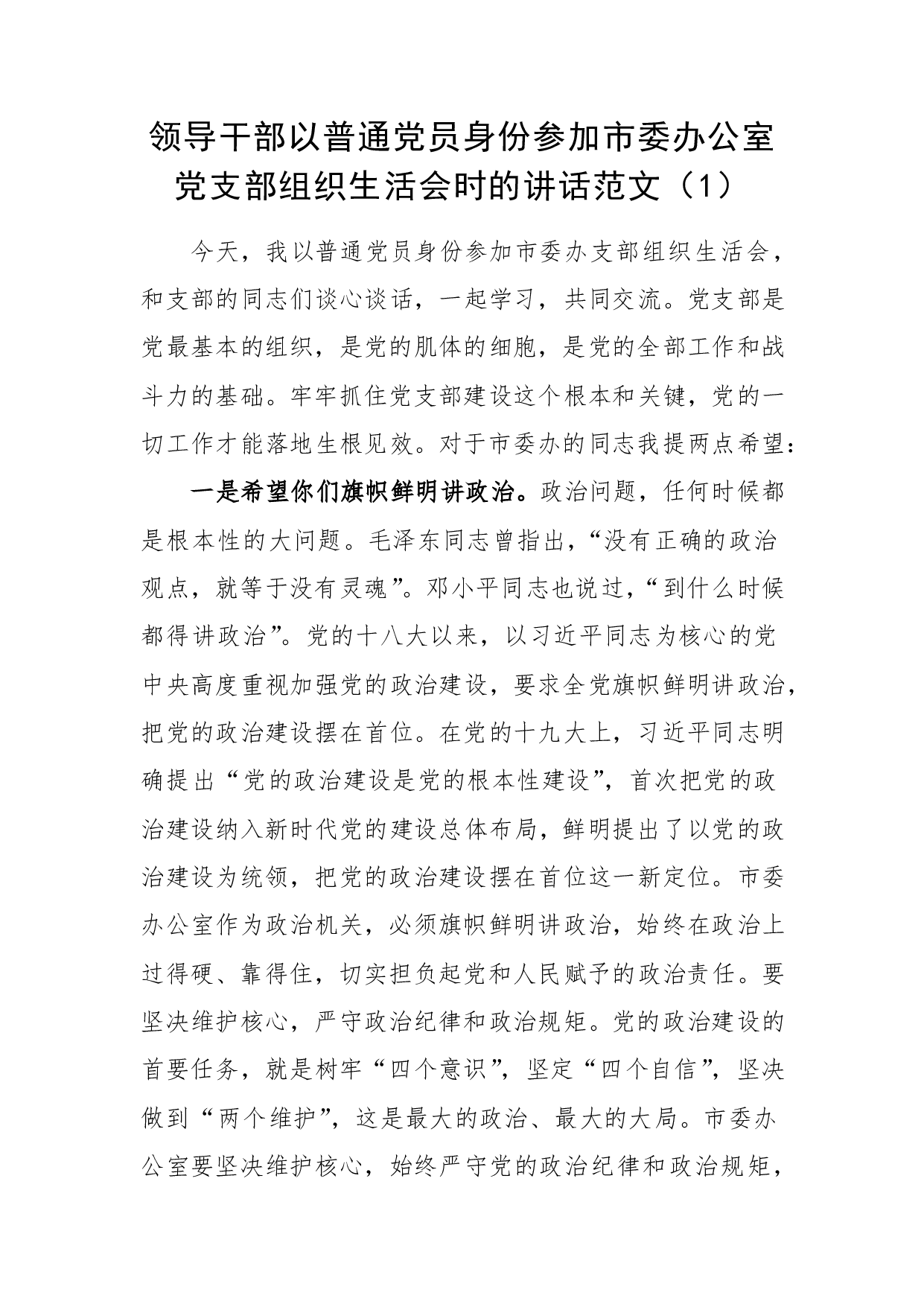 标题:领导干部以普通党员身份参加党支部组织生活会时的讲话2篇