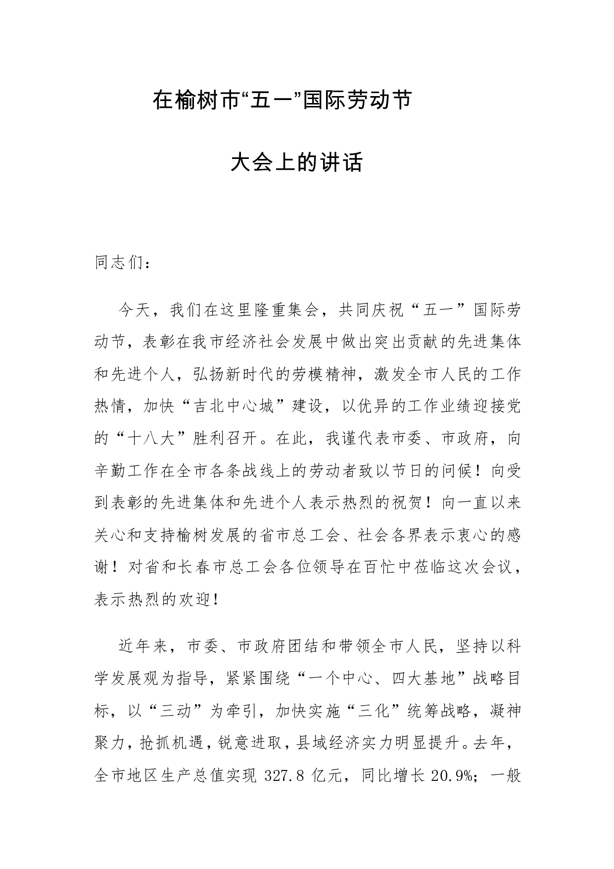 标题:市委书记在榆树市“五一”国际劳动节大会上的讲话
