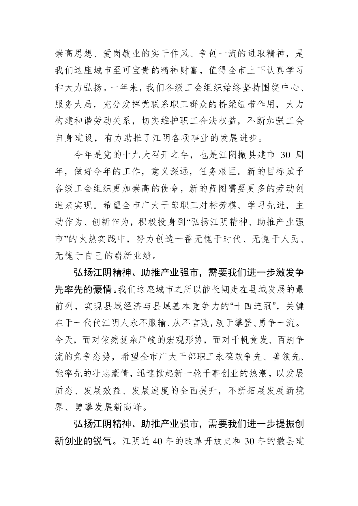 标题:陈金虎:在江阴市庆“五一”先进表彰大会暨“弘扬江阴精神、助推产业强市”劳动竞赛启动