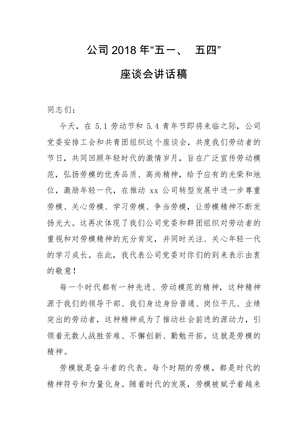 标题:公司2018年“五一、五四”座谈会讲话稿