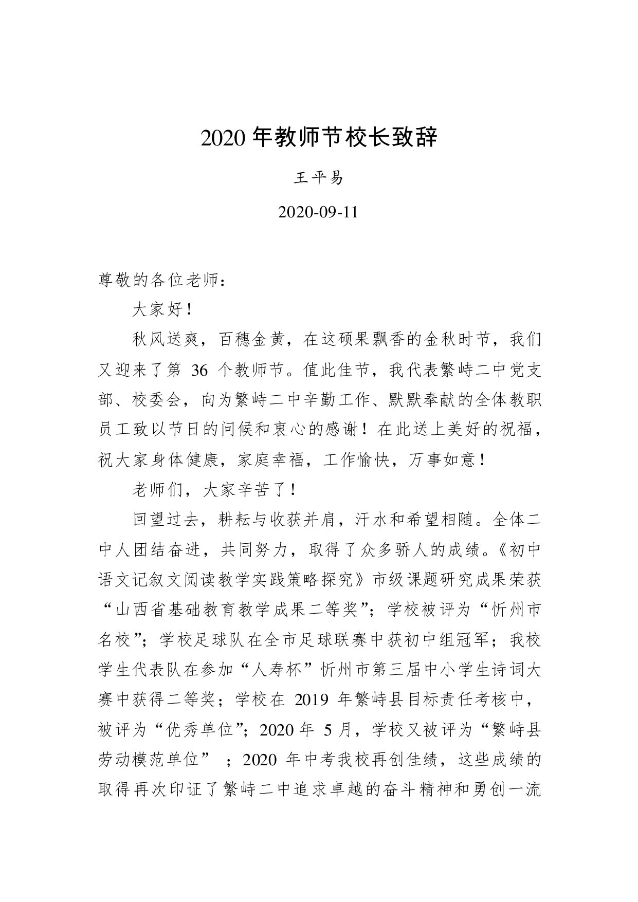 标题:王平易:2020年教师节校长致辞