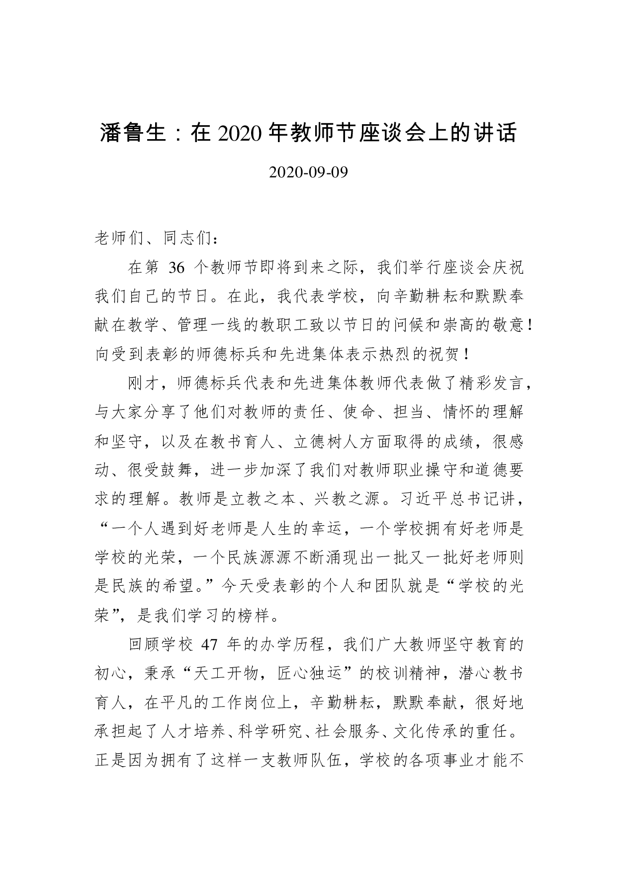 标题:潘鲁生:在2020年教师节座谈会上的讲话