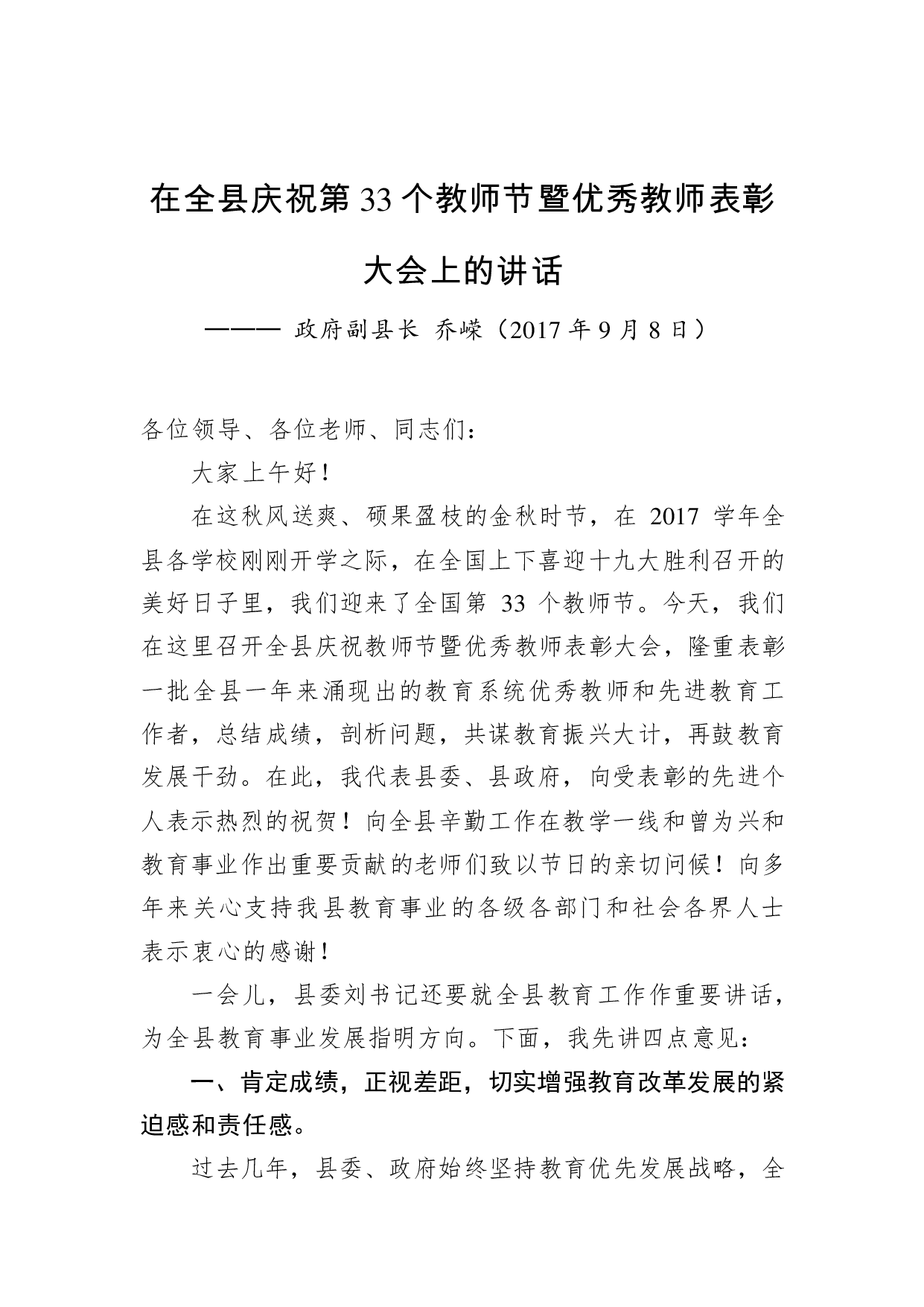 标题:乔嵘:在全县庆祝第33个教师节暨优秀教师表彰大会上的讲话