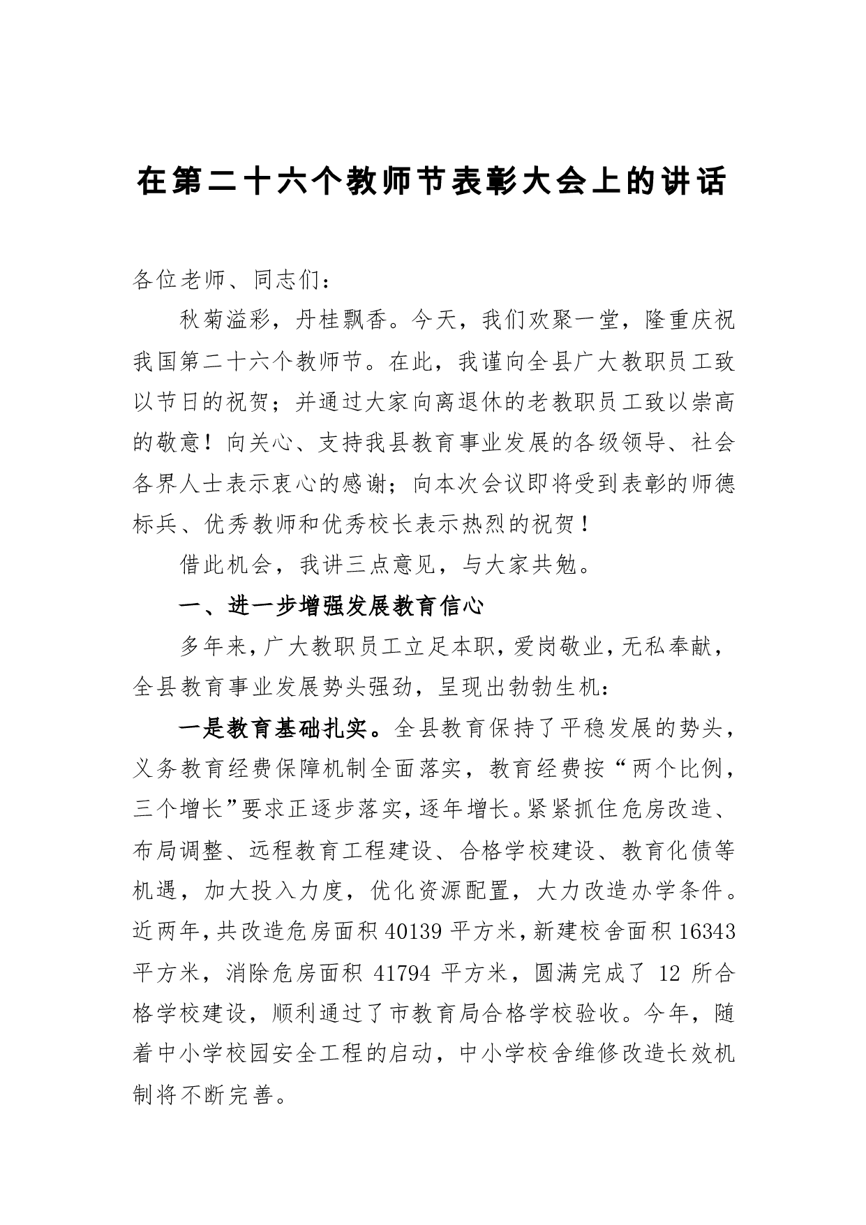 标题:在第二十六个教师节表彰大会上的讲话
