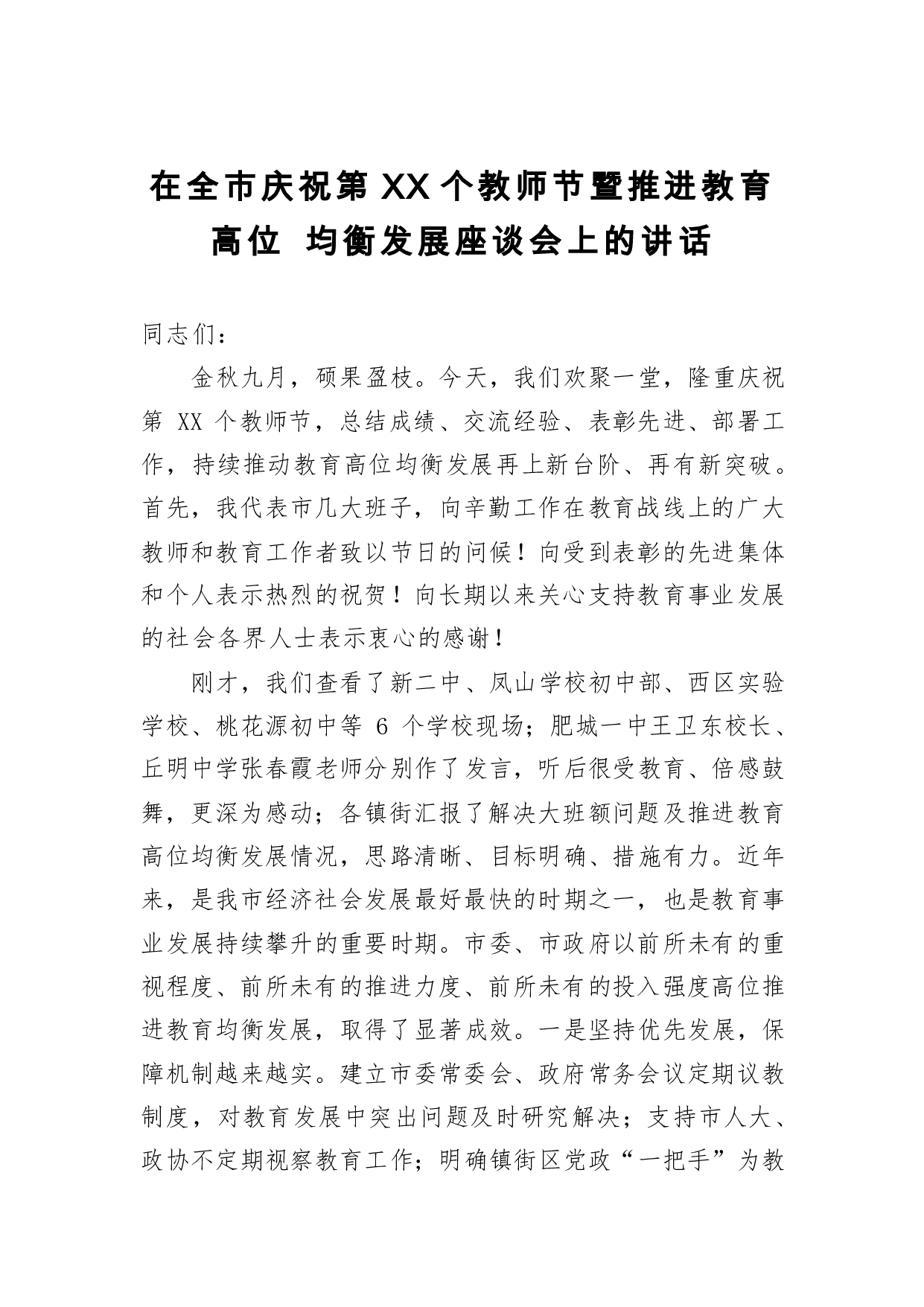 标题:在全市庆祝第XX个教师节暨推进教育高位均衡发展座谈会上的讲话