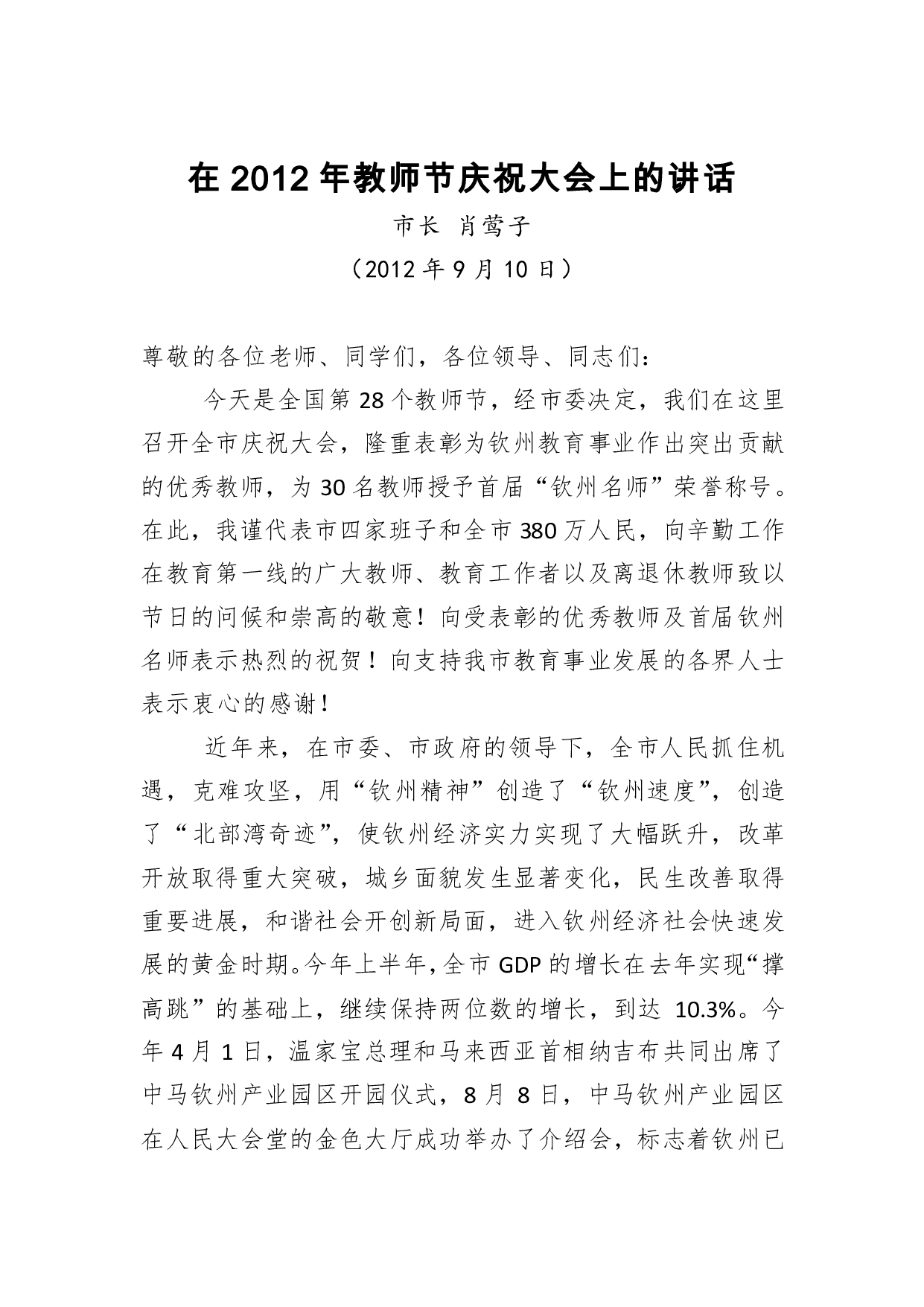 标题:肖莺子:在2012年教师节庆祝大会上的讲话
