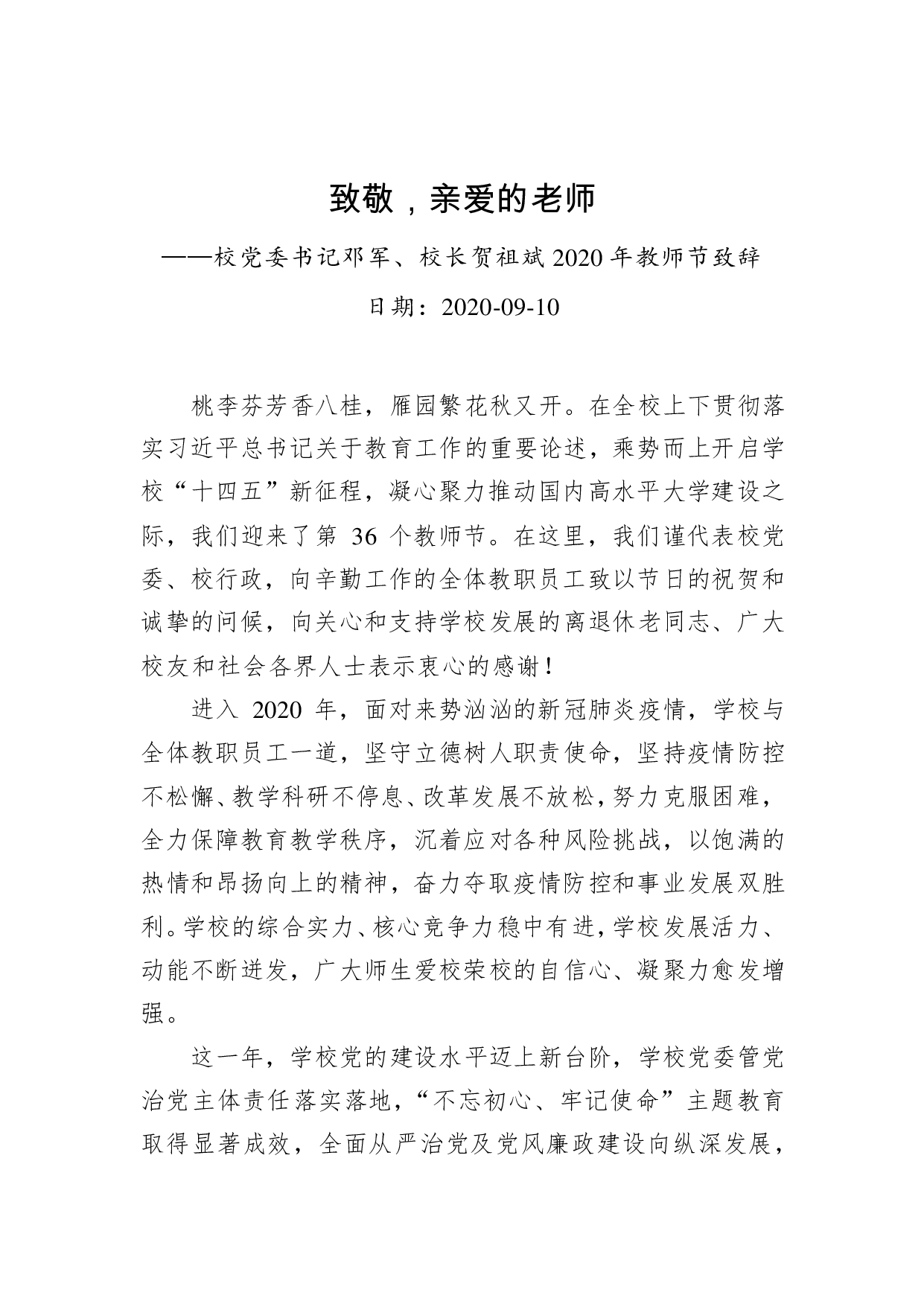 标题:致敬,亲爱的老师——校党委书记邓军、校长贺祖斌2020年教师节致辞