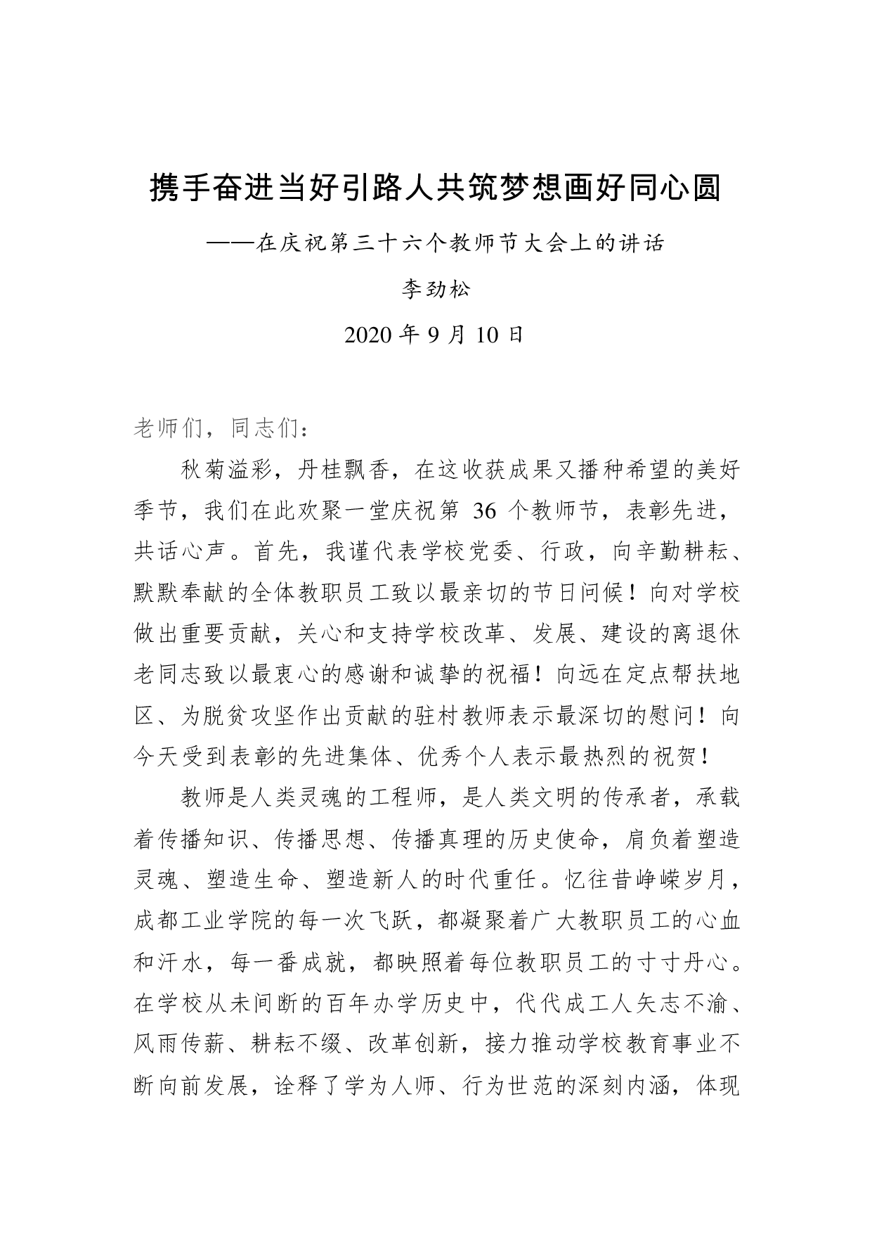 标题:李劲松:携手奋进当好引路人共筑梦想画好同心圆——在庆祝第三十六个教师节大会上的讲话