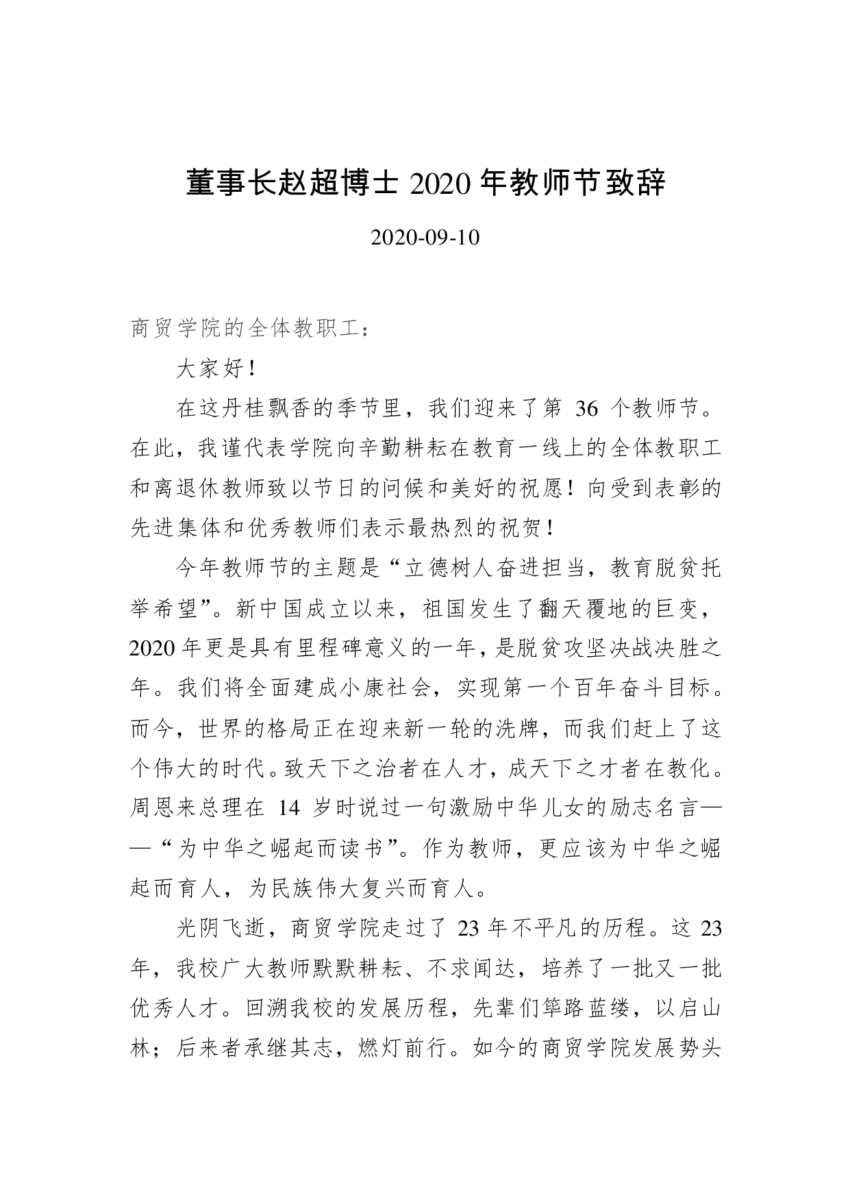 标题:董事长赵超博士2020年教师节致辞