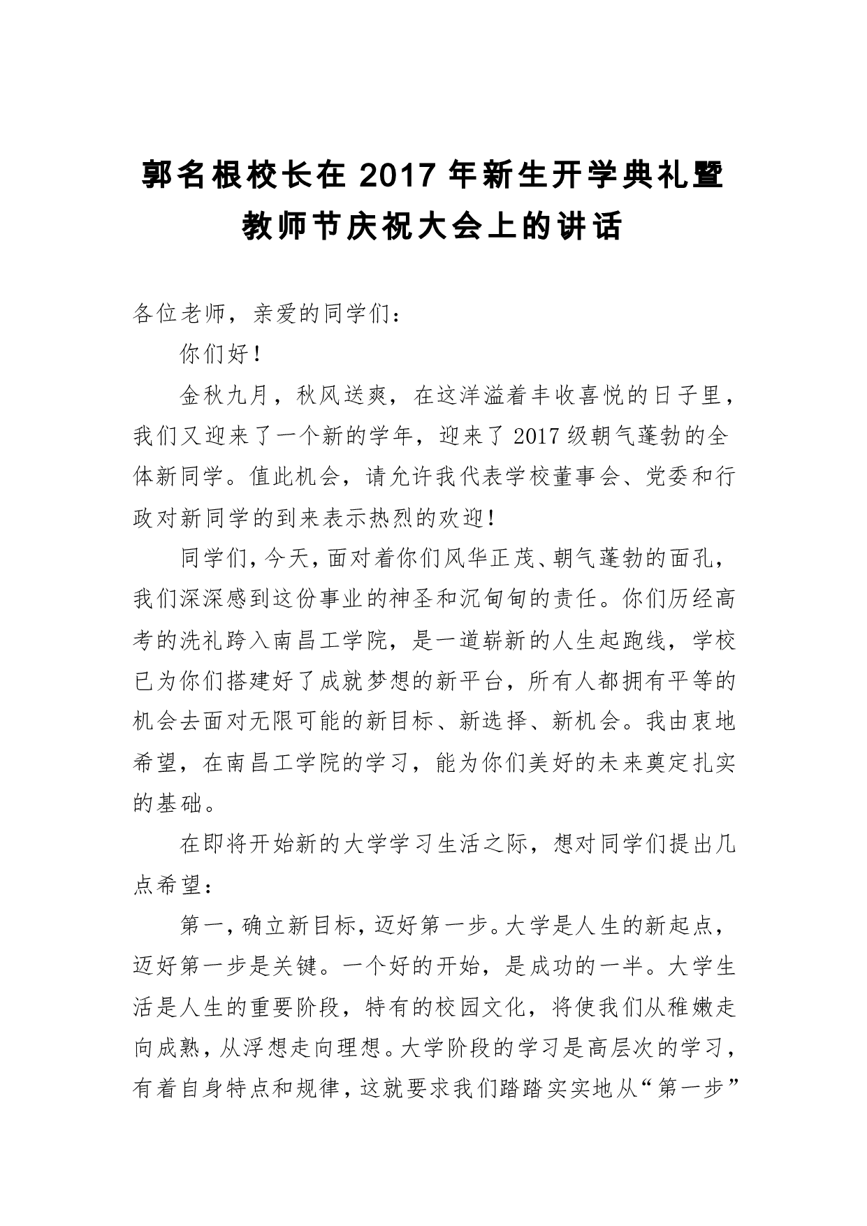 标题:教师节讲话:郭名根校长在2017年新生开学典礼暨教师节庆祝大会上的讲话