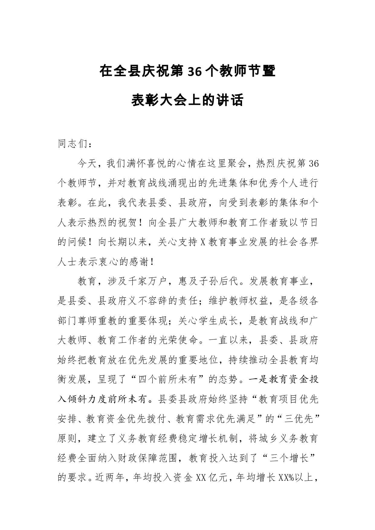 标题:在全县庆祝第36个教师节暨表彰大会上的讲话